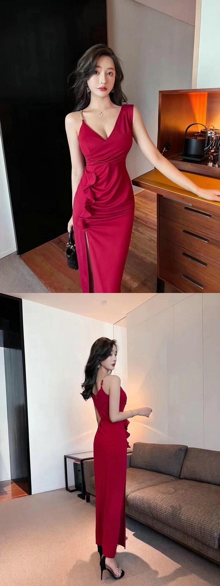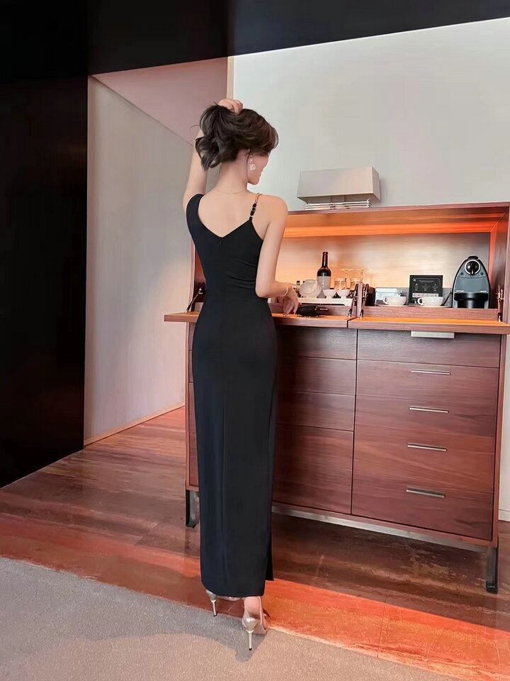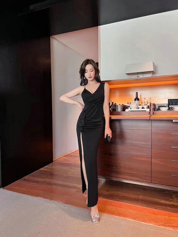 ナイトクラブの女性のイブニングドレスロングスカートナイトクラブのハイエンド気質セクシーなVネックハイスリットサスペンダードレス micat64997416526