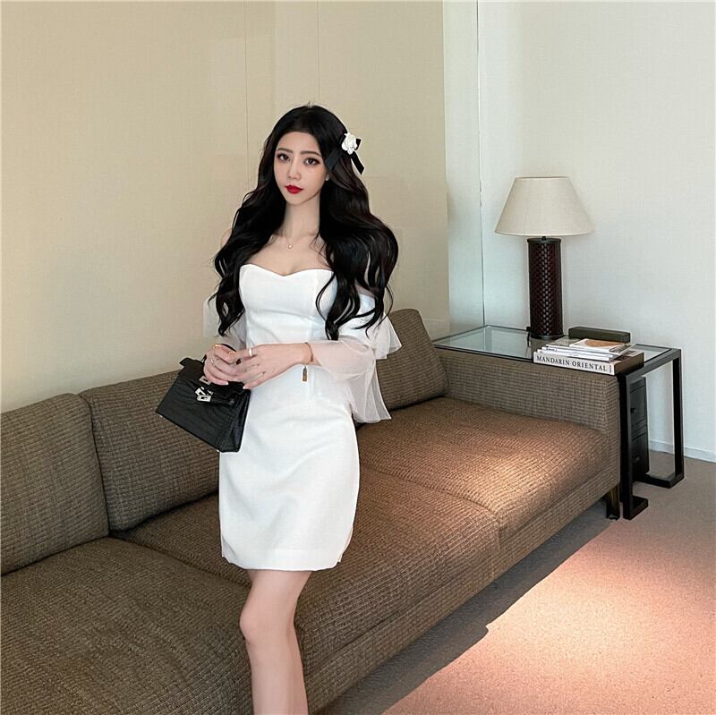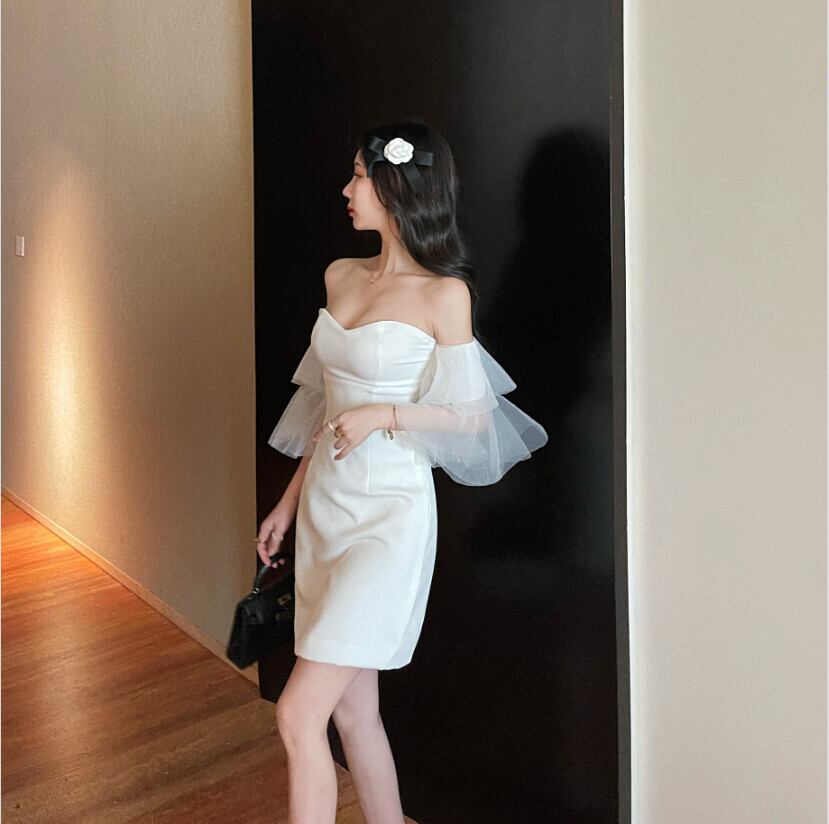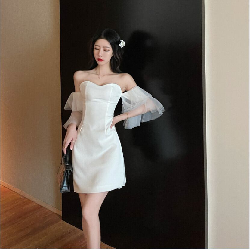 フレンチスモールドレスショートパラグラフスーパーフェアリートランペットスリーブパーティーナイトショップセクシーローカットディープVネックチューブトップドレス micat76992971380