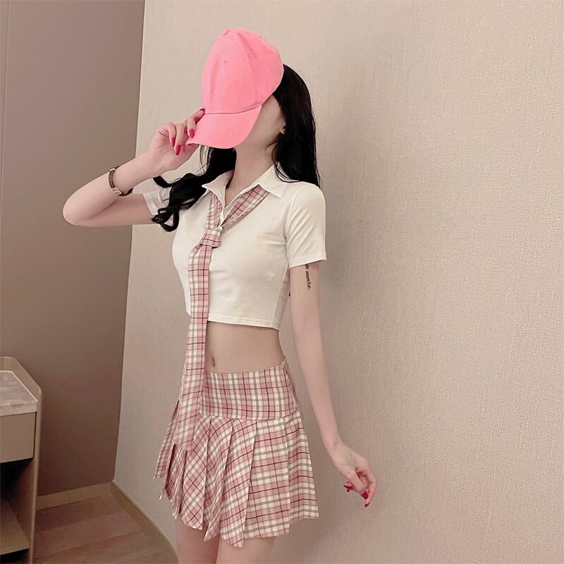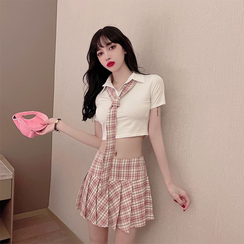 jkユニムスーツピュアデザイアカレッジスタイルセクシーショートベリーボタンネクタイトップ+プリーツスカート micat27586767195