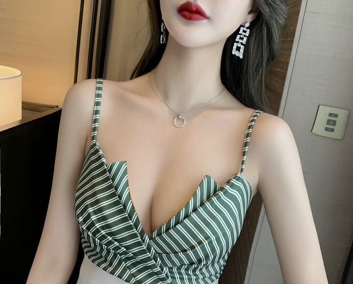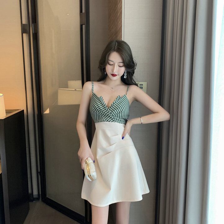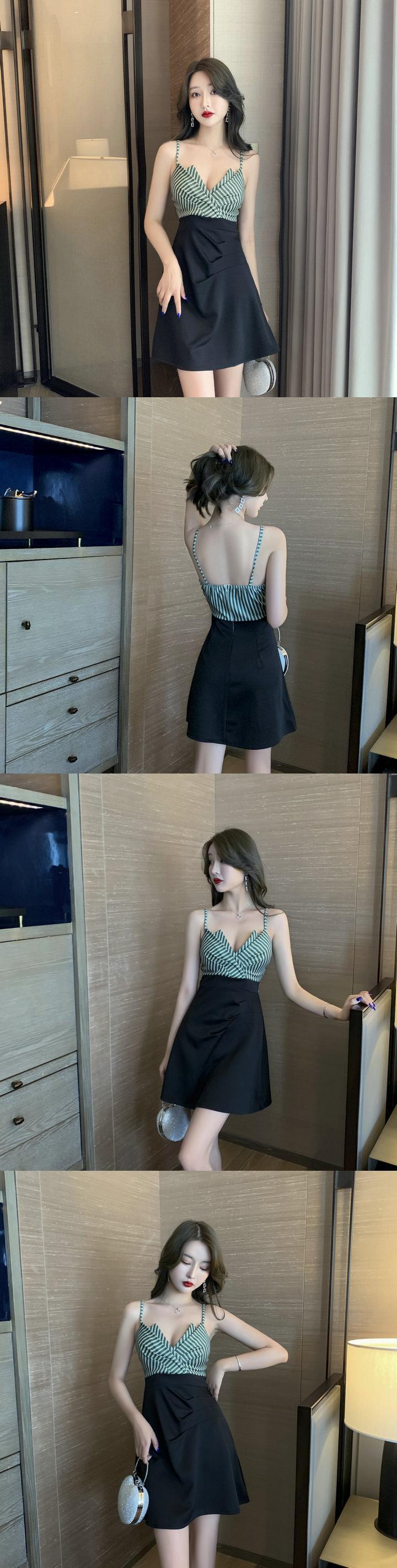 ナイトクラブの女性の作業服は、薄い気質のセクシーな作業服を示していますローカットの深いVネックのストライプのサスペンダードレス micat94218393328