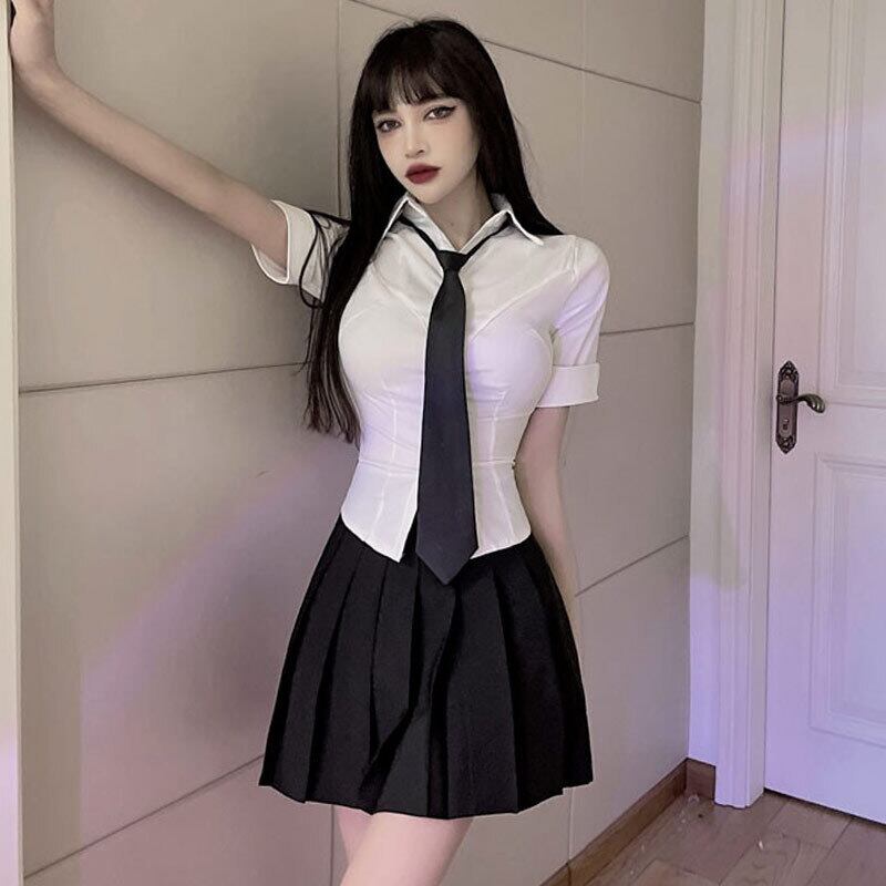 JK unimunim女性の純粋な欲望スタイルセクシーなタイトなショートネクタイ白いシャツ+プリーツスカートツーピースセット micat35633516228