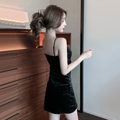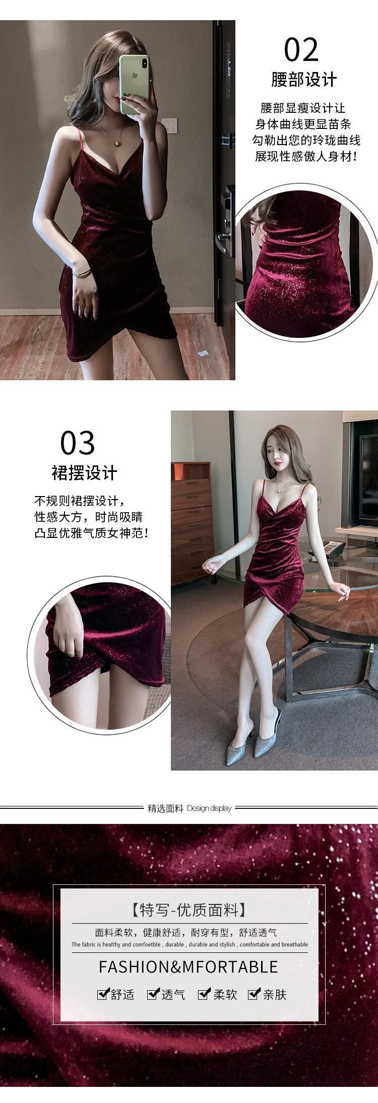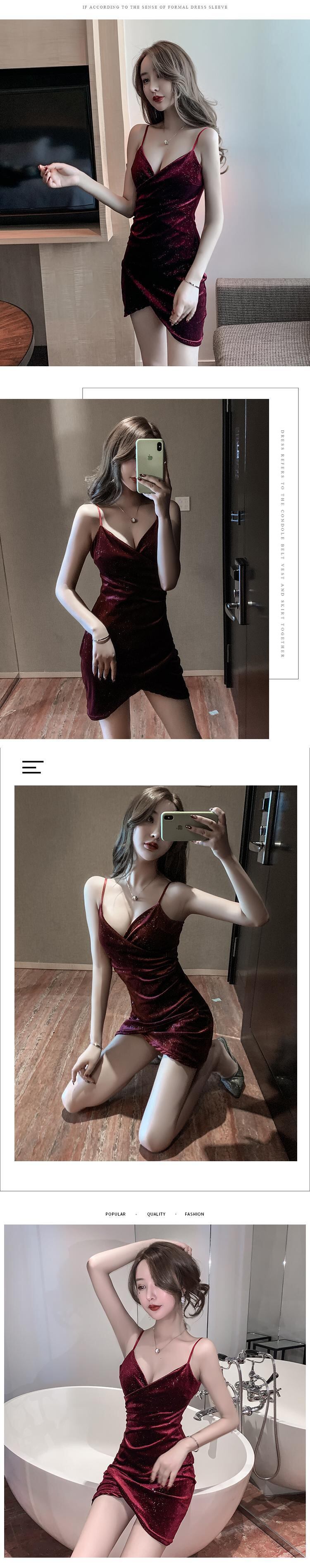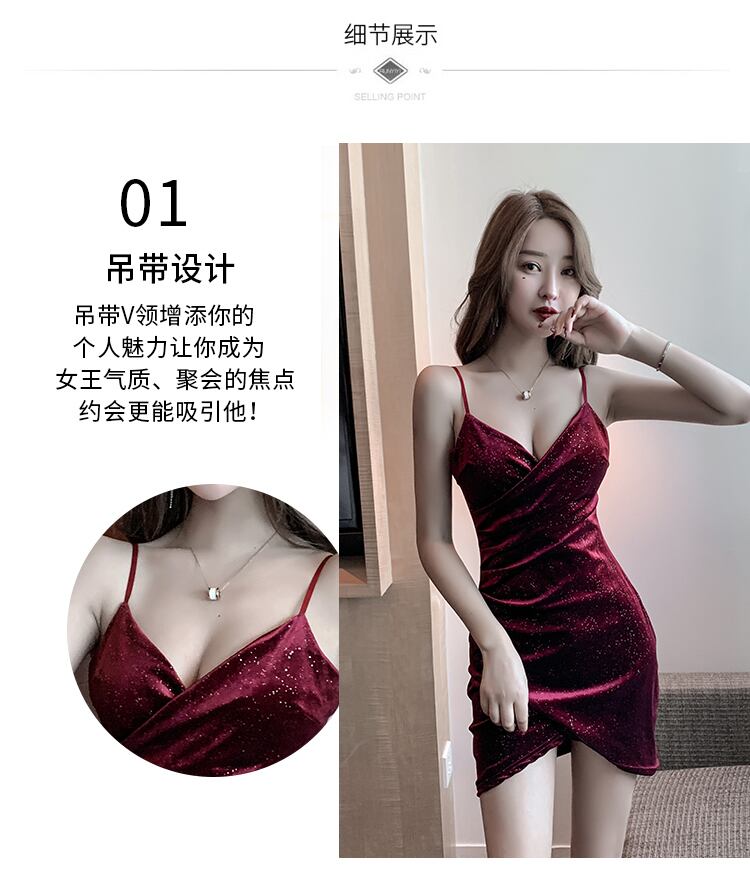 ナイトクラブの女性の夜の作業服光沢のあるセクシーなローカットディープVネックゴールドベルベットサスペンダードレス micat24017836686