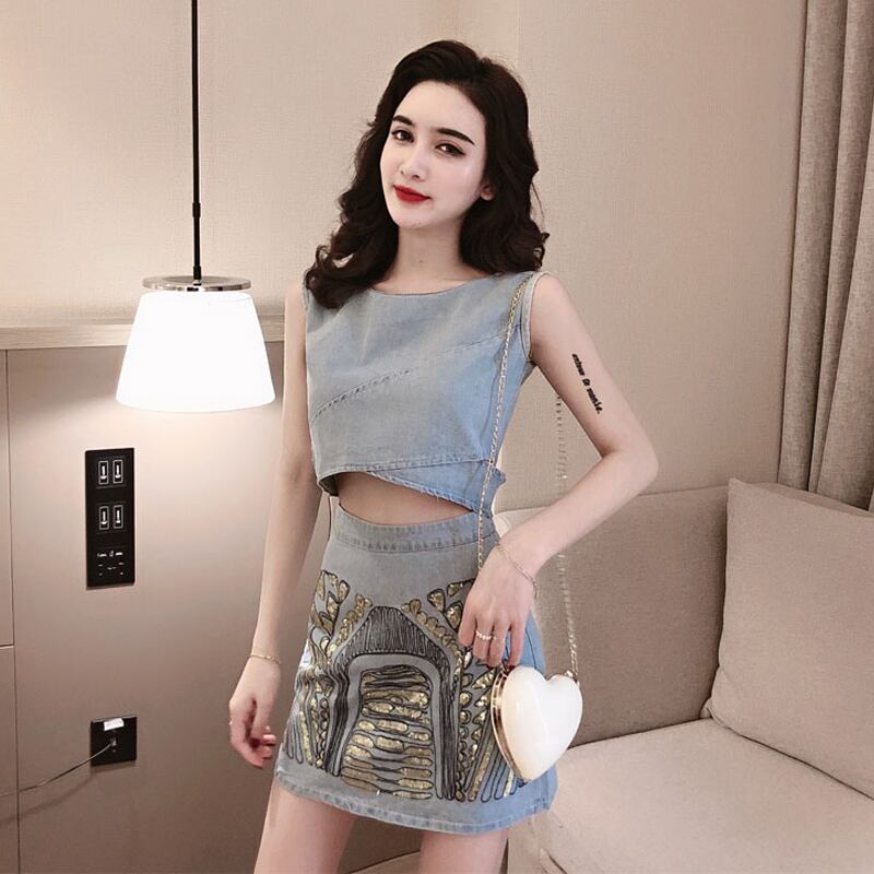 ネットレッドスーツウエスタンスタイルの年齢を減らす夏の新しいノースリーブショートトップ+ハイウエストショートパッケージヒップデニムスカート micat93011279388