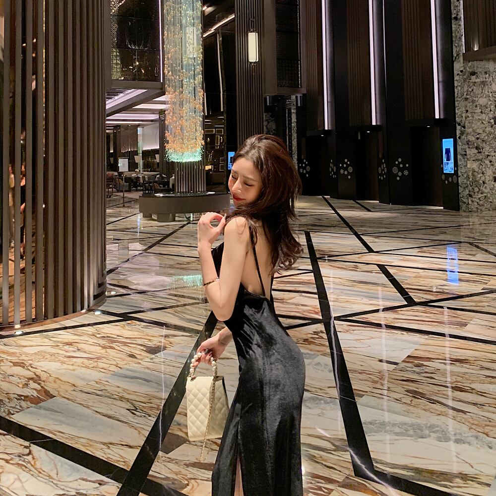 セレブイブニングドレス2020新しい宴会気質ローカットVネックラージバックレスベルベットミドル丈サスペンダードレス micat17521553091
