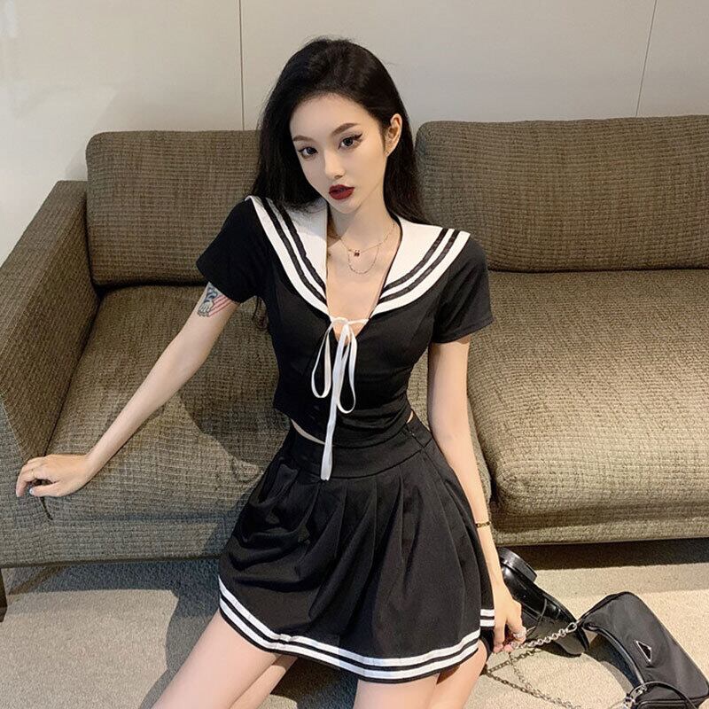ウエスタンスタイルの年齢を減らすツーピースのファッションスーツスウィートネイビーカラーのクロップドトップ+ハイウエストのふくらんでいるスカートのツーピースセット micat3233303528
