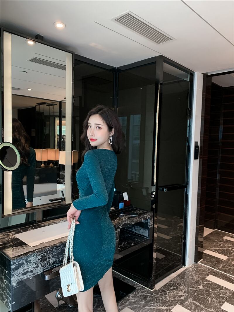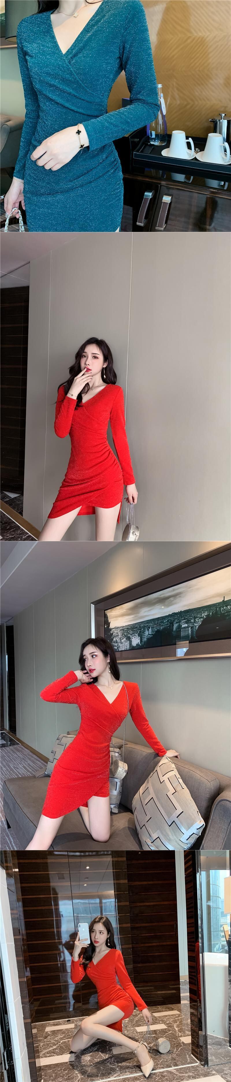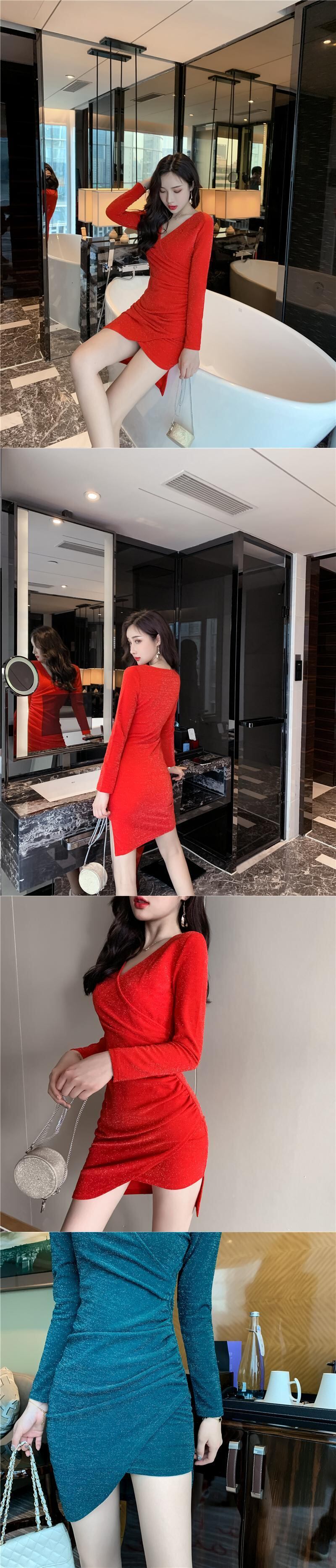 2021年人気のスカート春ファッションピカピカシルクセクシーVネックショートイレギュラーパッケージヒップボトミングワンピース micat65456299599