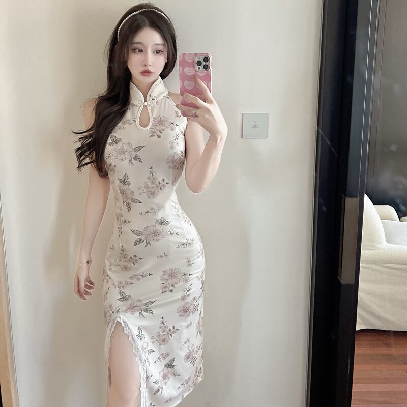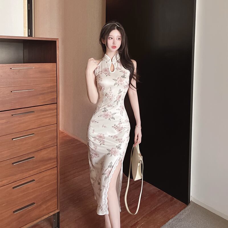 イブニングドレスチャイナドレスヤング改良ハイエンド気質レトロプリントセクシーオフショルダーミドル丈ホルタードレス micat12837357319