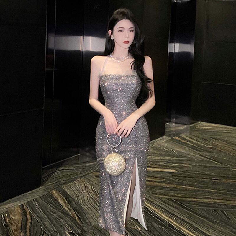 イブニングドレスライトラグジュアリーニッチハイエンドナイトショースパークリングスパンコール気質セクシーバックレスミドル丈ホルタードレス micat96584293216