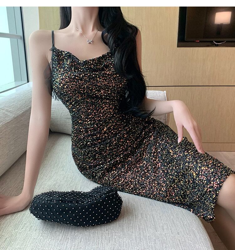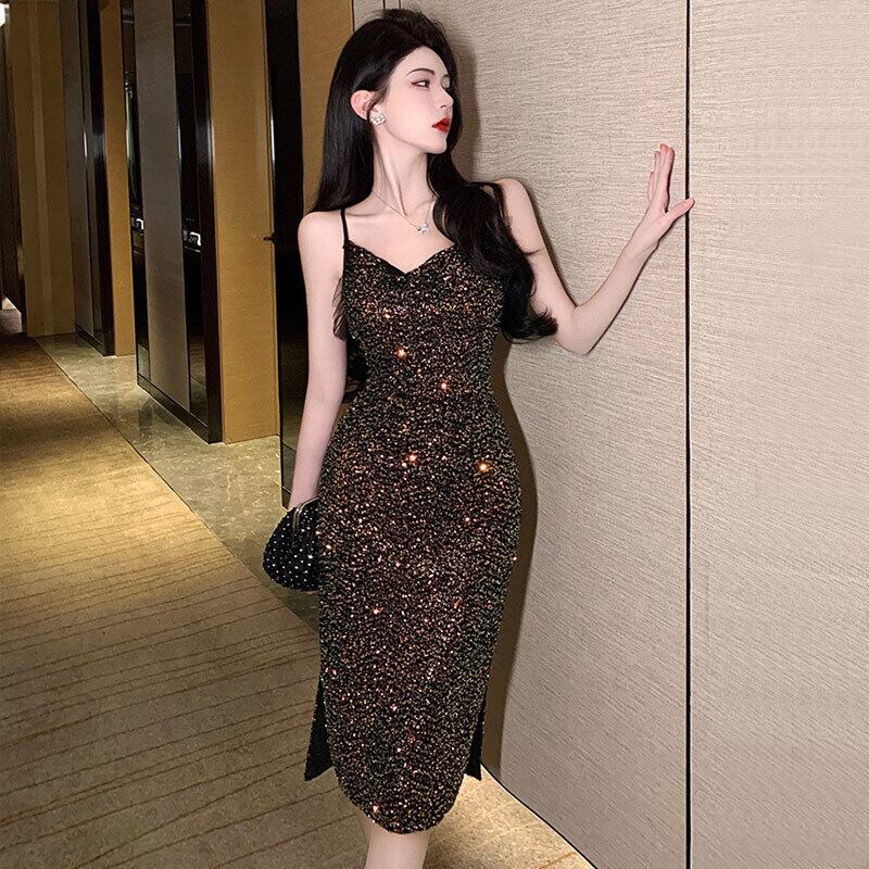イブニングドレススカート女性の宴会気質ライトラグジュアリーニッチハイエンドスモールセレモニースカートレディース見事なスパンコールサスペンダードレス micat8120535610