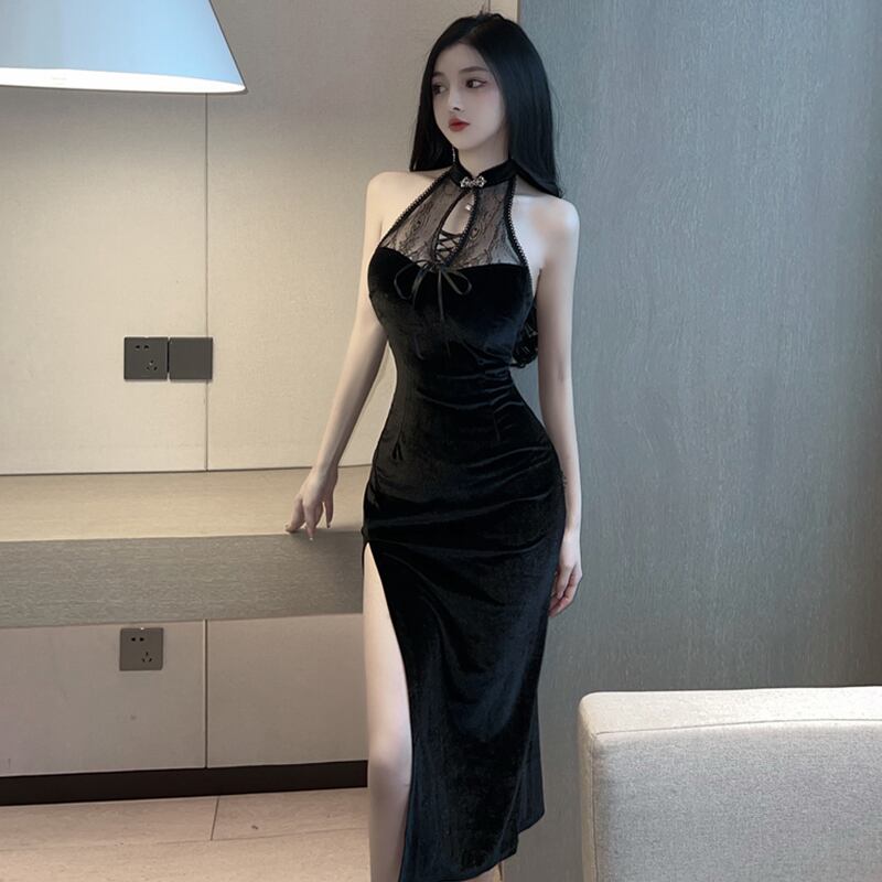 黒のイブニングドレスロングドレスナイトクラブ女性のナイトクラブセクシーな背中の開いたレースの吊り首は改善されたチャイナドレス micat30845345884