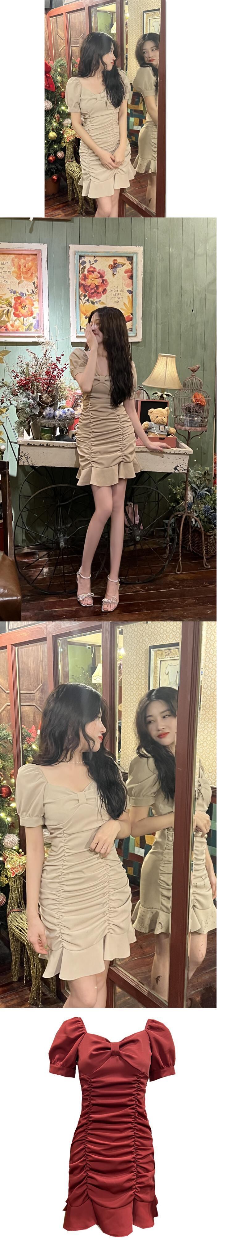 フランスのヘップバーンスタイルのティーブレイク小さな赤いスカート女性の夏のニッチ気質セクシーなスクエアネックパフスリーブフィッシュテールドレス micat96442154320