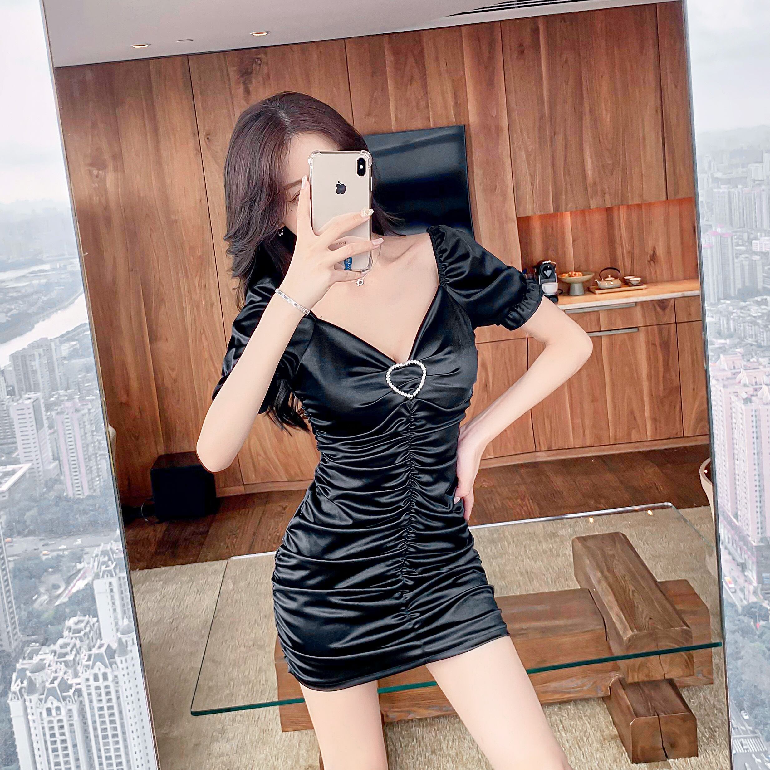 ナイトクラブ婦人服技術者オーバーオール気質セクシーローカットディープVネックフレンチパフスリーブサテンパンヒップドレス micat96348466964