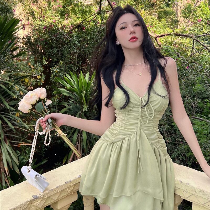 サスペンダースカートレディースサマーアウターウェアピュアデザイアスタイルフレンチスウィート気質セクシーVネックネクタイウエストスリムワンピース micat54492227828