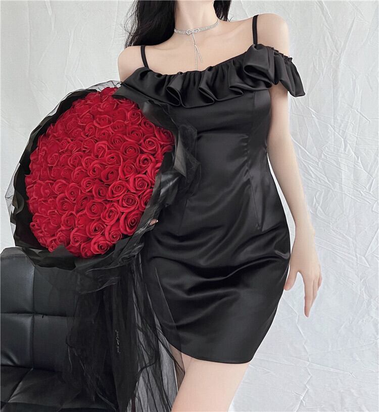 フレンチブラックスモールスカートショートハイエンド気質フリルセクシーオフショルダースリムバッグヒップサスペンダードレス micat59924075988