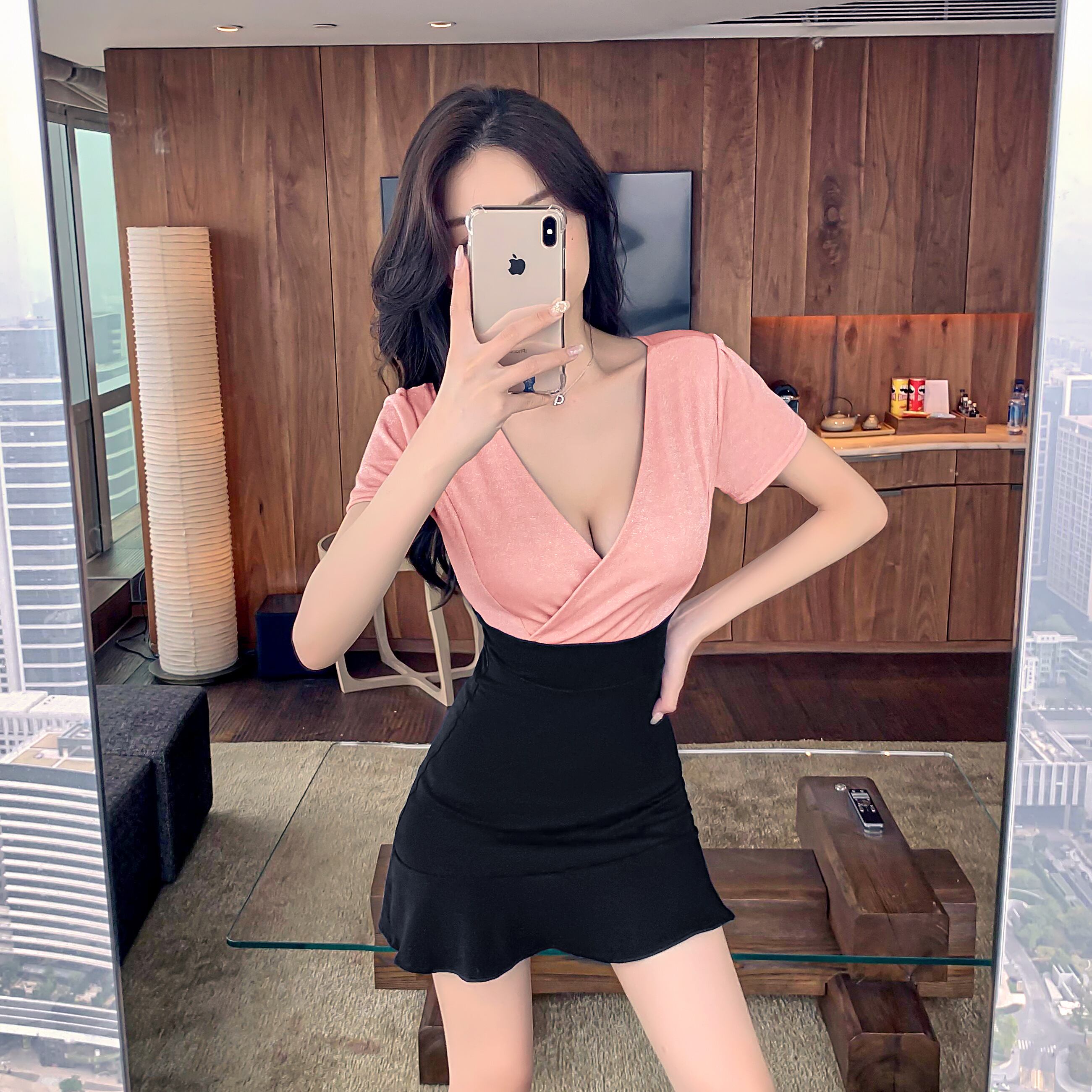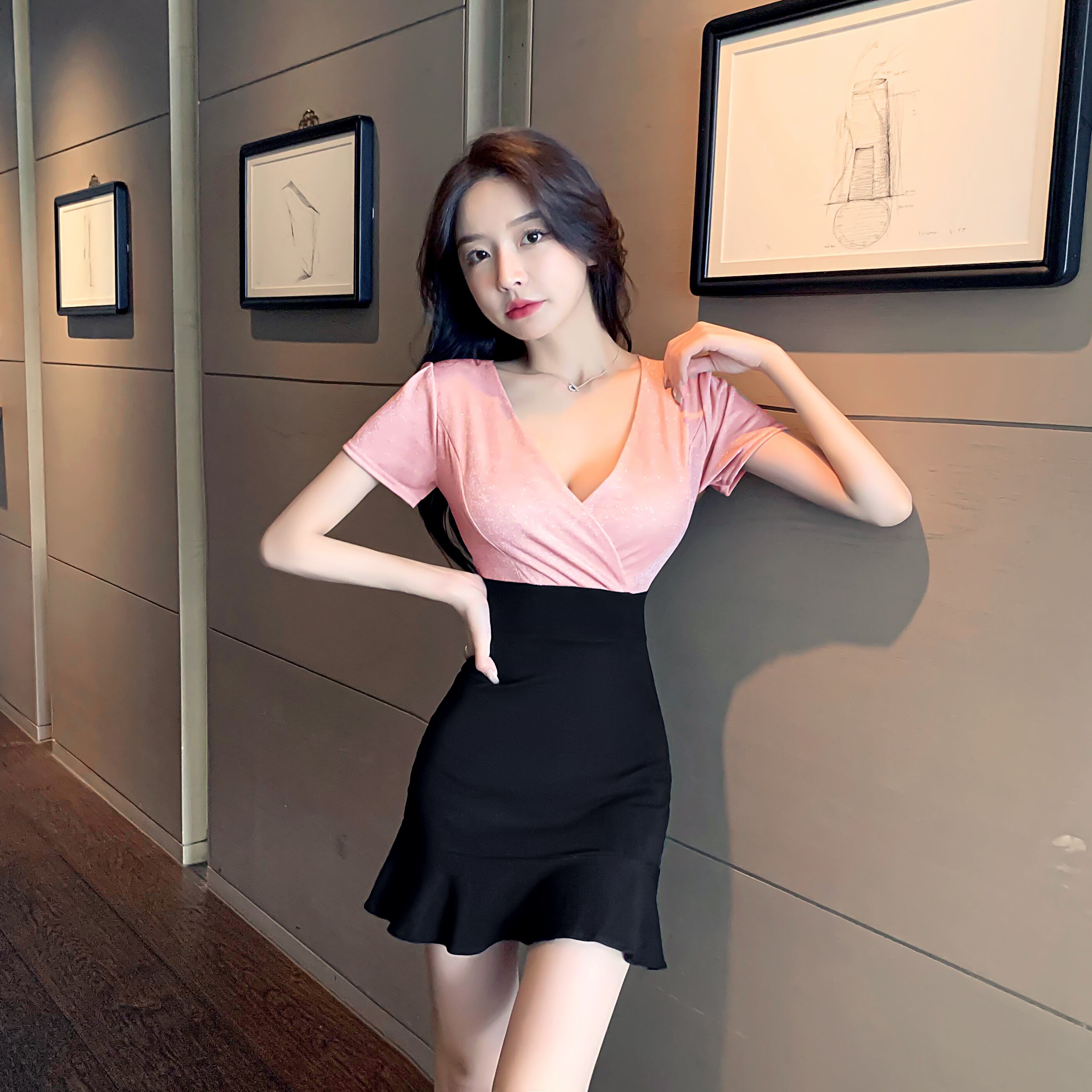 ナイトクラブの女性の足浴技術者のオーバーオール光沢のあるシルクセクシーなローカットディープVネック半袖フィッシュテールドレス micat23109035406