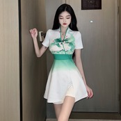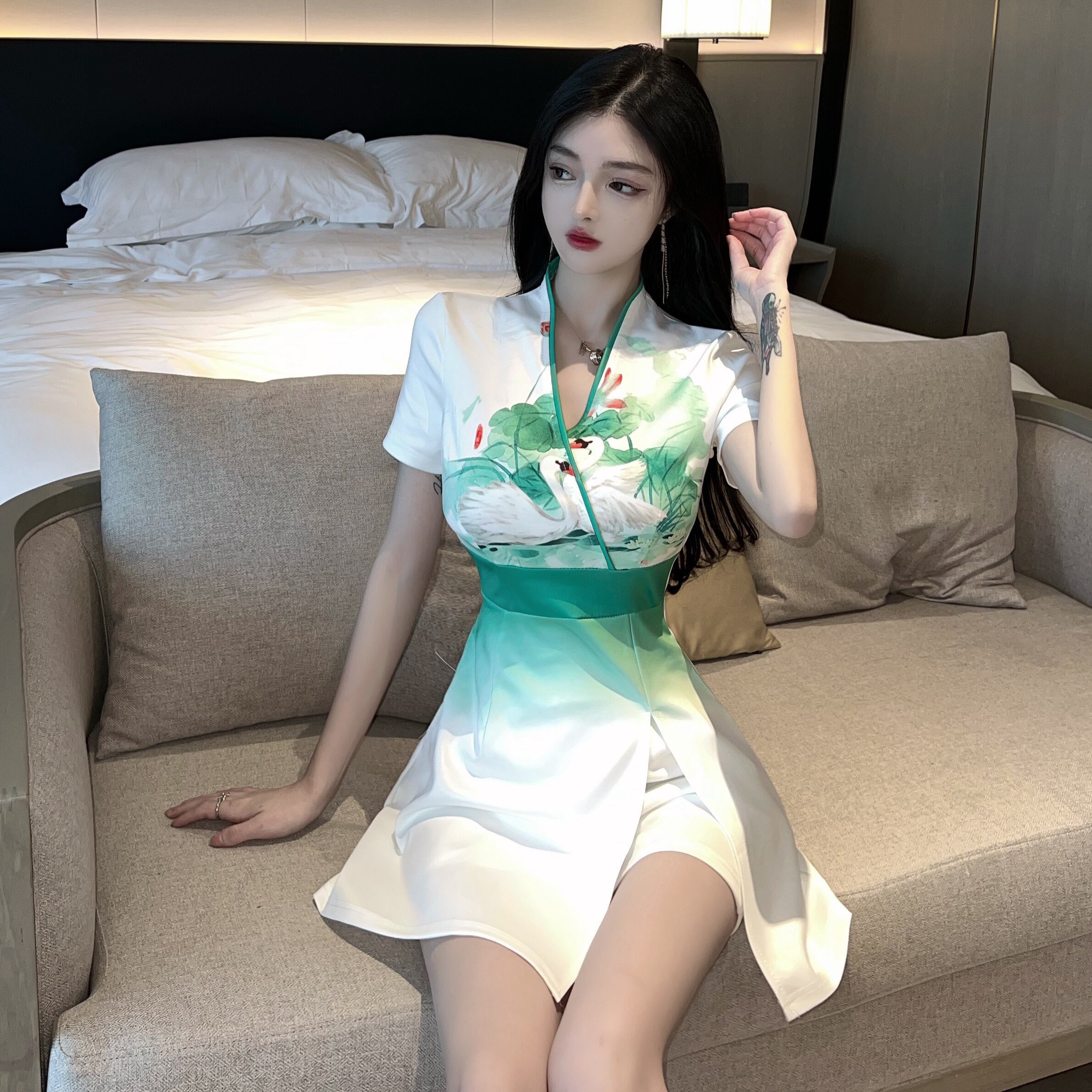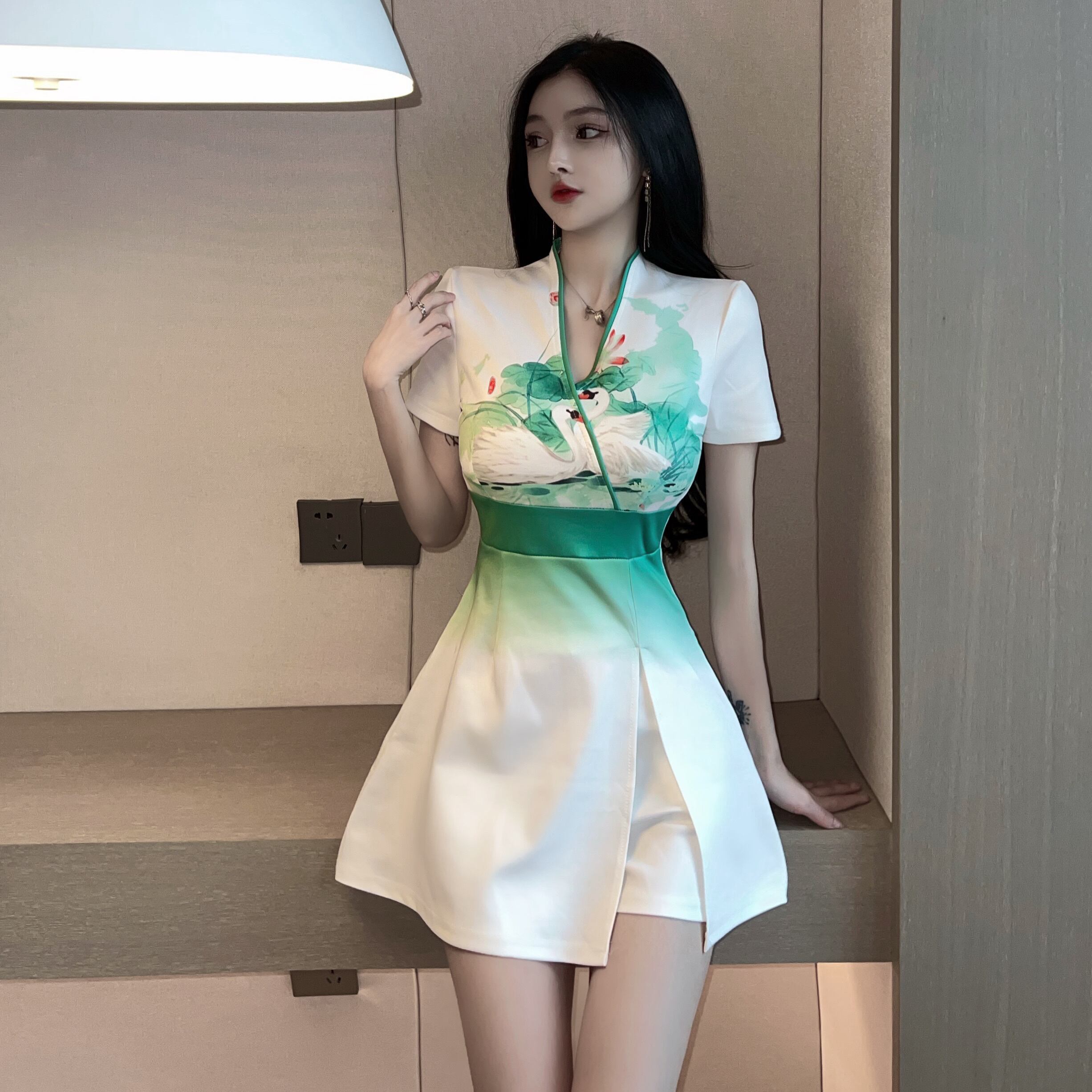 ナイトクラブ女性美容院フットバス技術者オーバーオールスーツ中国風プリント気質ウエストスリムドレス micat1935233175