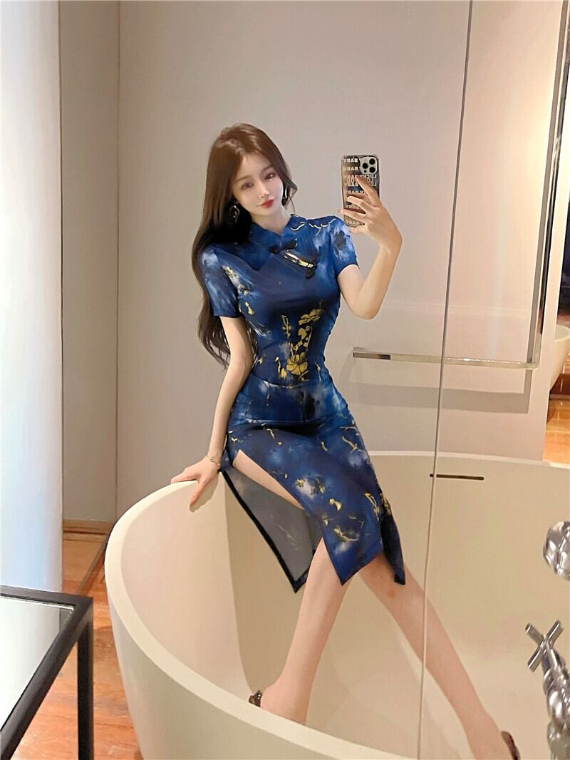 チャイナスタイル改良チャイナドレスレディースサマーセクシーミドル丈ハイスリットワンピース+ショーツツーピースセット micat78516512562