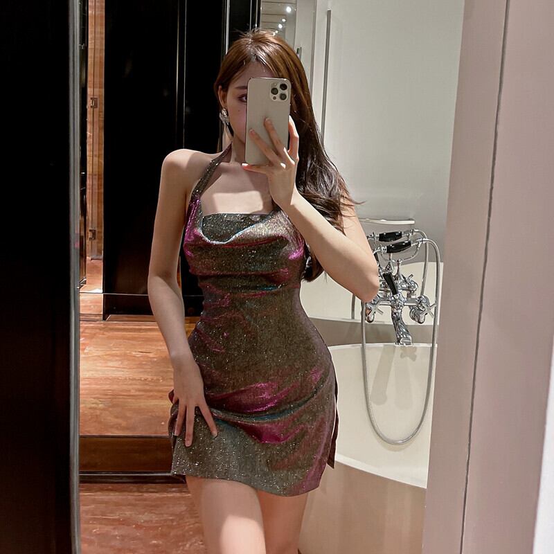 ナイトクラブの女性のナイトクラブの宴会の気質光沢のある小さなドレススカートセクシーな背中の開いたスプリットホルタードレス micat52038762027