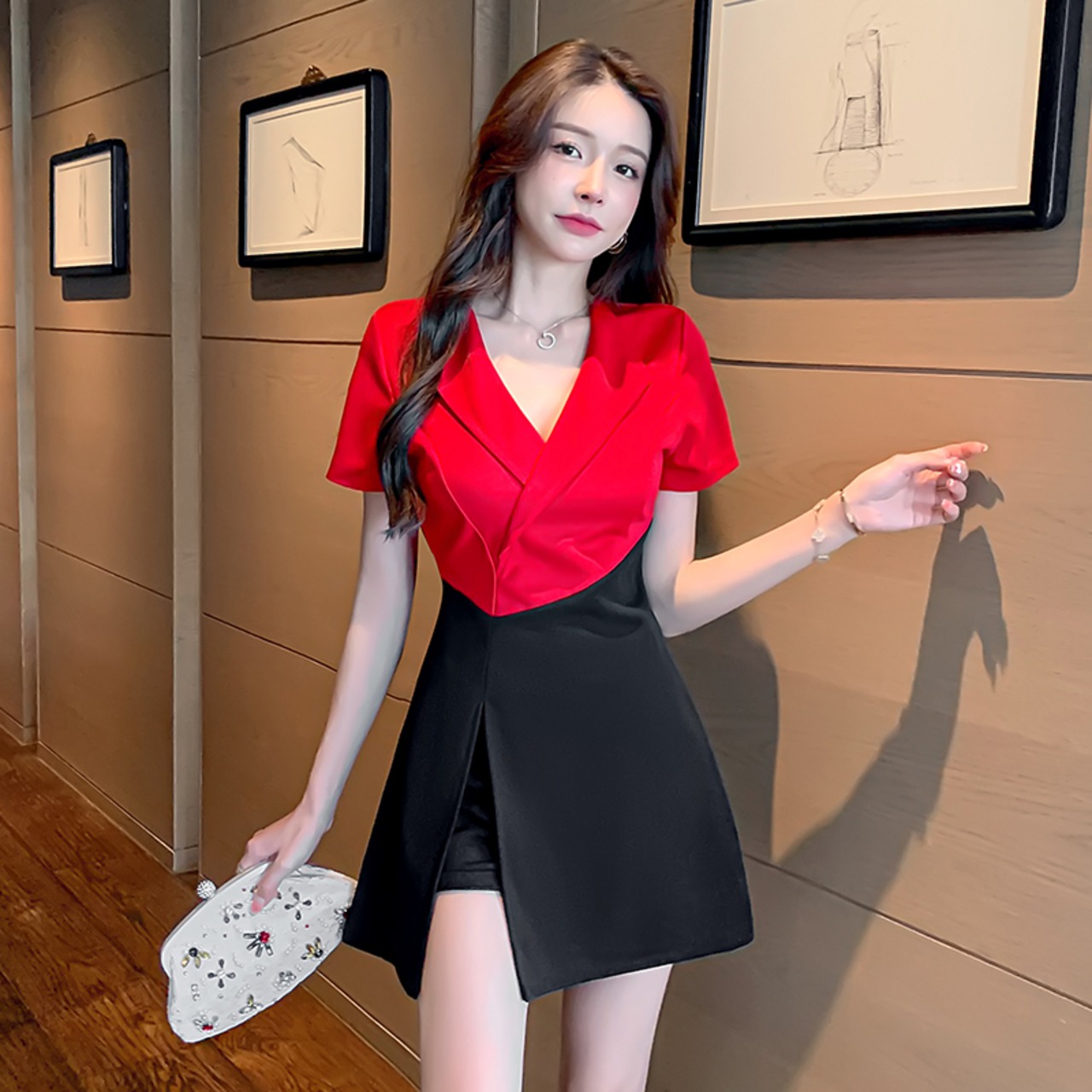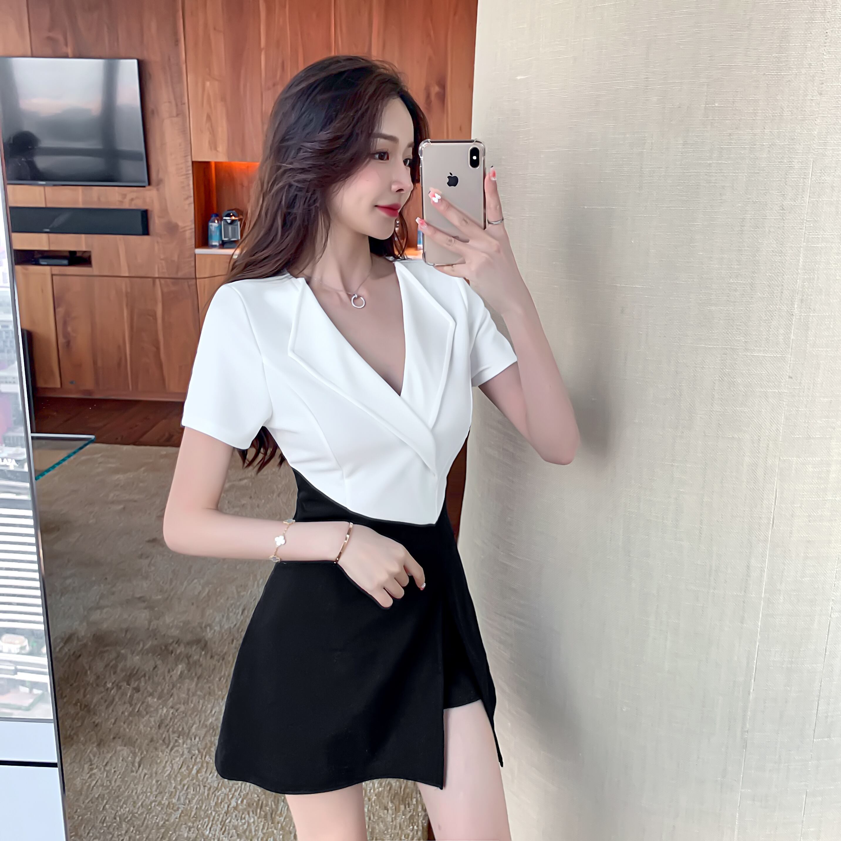 ナイトクラブの女性の足湯技術者のオーバーオール気質セクシーなVネックウエストスリムフェイクツーピース半袖ドレス micat26170705066
