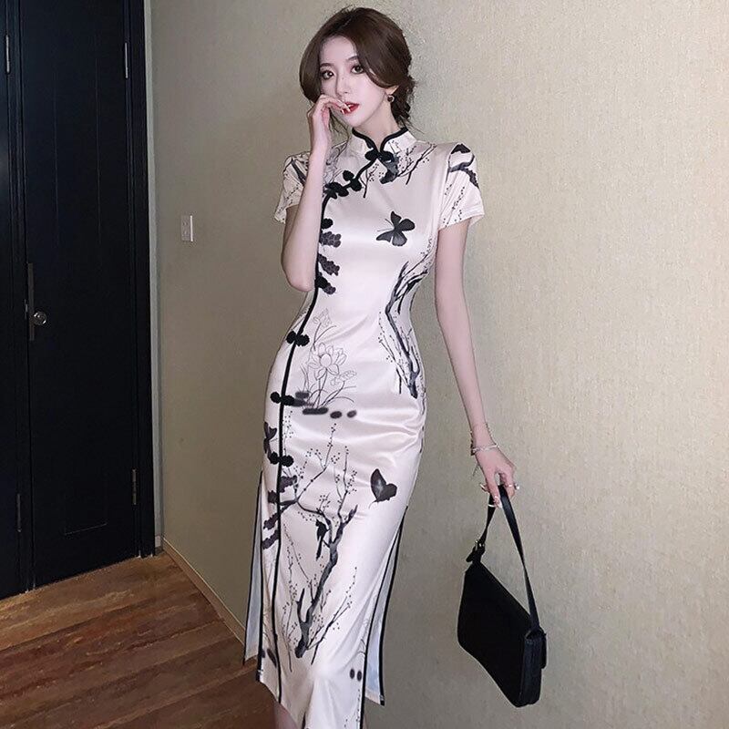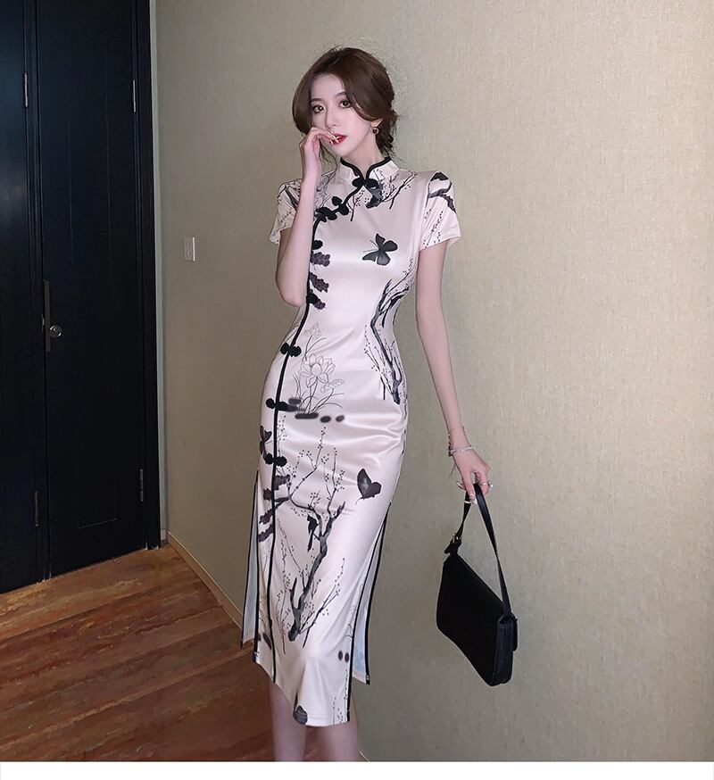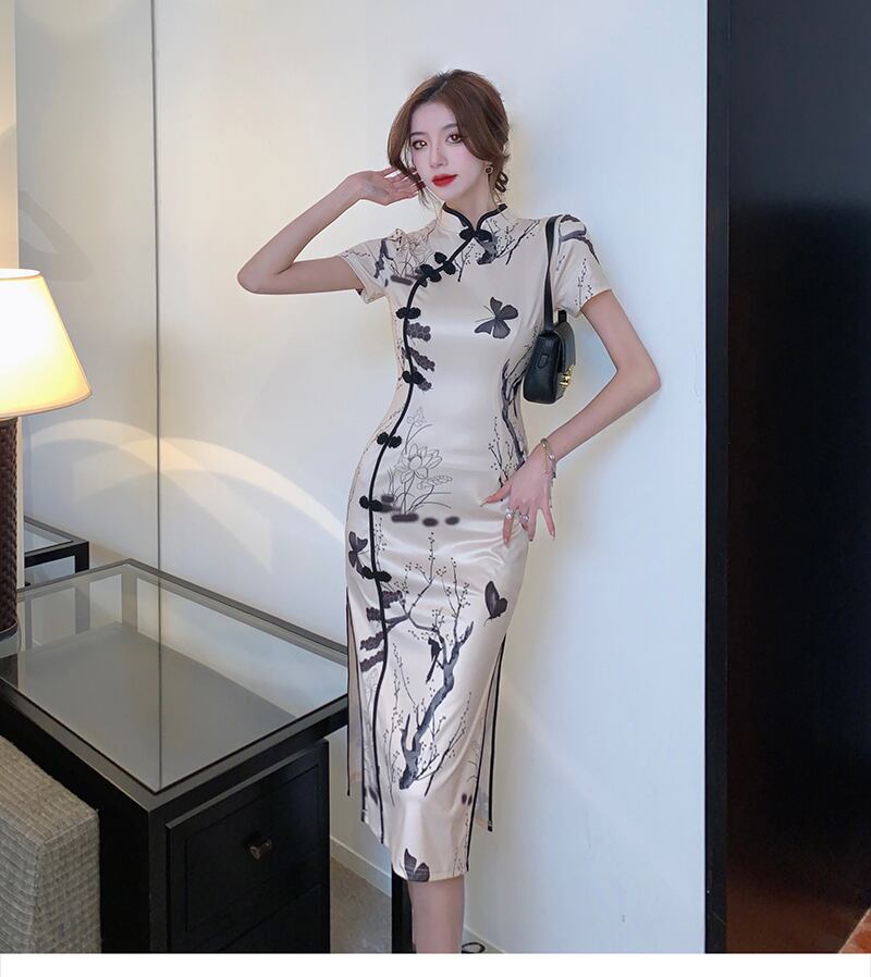 改良されたチャイナドレスの若い気質のハイエンドレトロ共和国スタイルのプリントセクシーなスプリット半袖ミッドレングスドレス micat38814678180