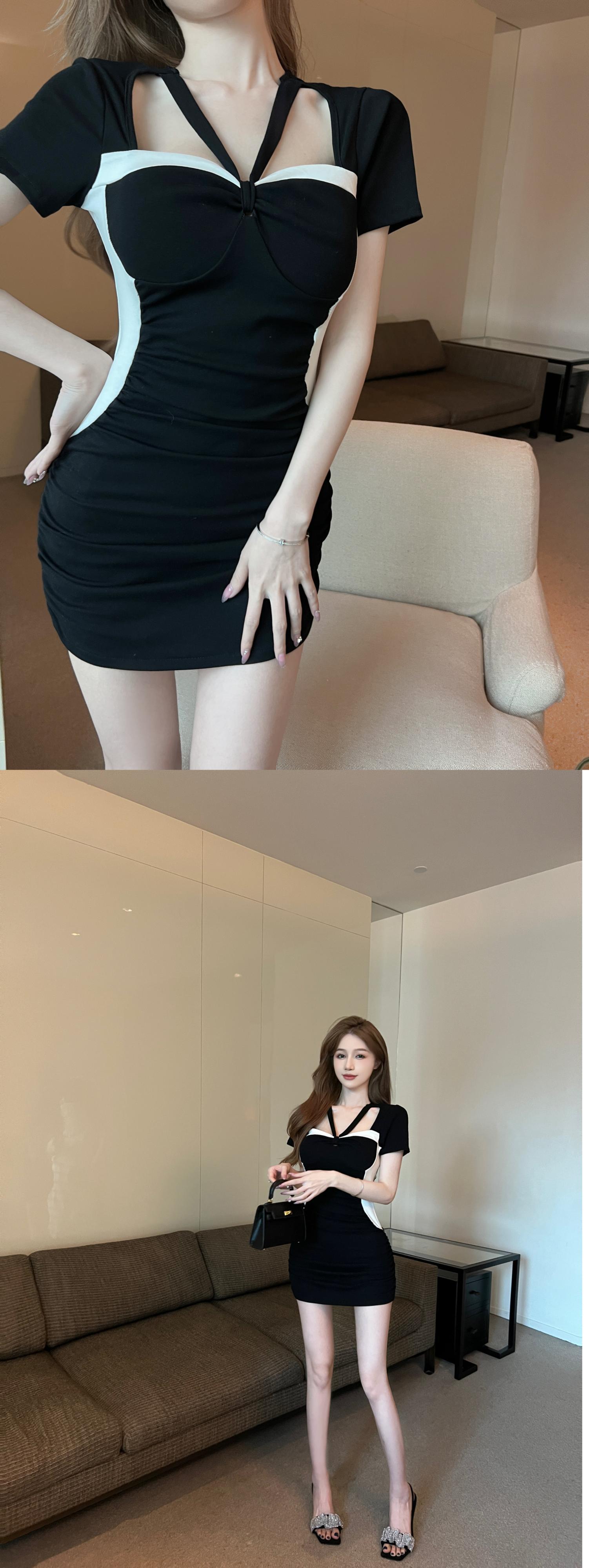 甘くてスパイシーな夏の婦人服2022新しい甘くてセクシーなスクエアネックコントラストカラーバッグヒップホルタードレス micat21428498198