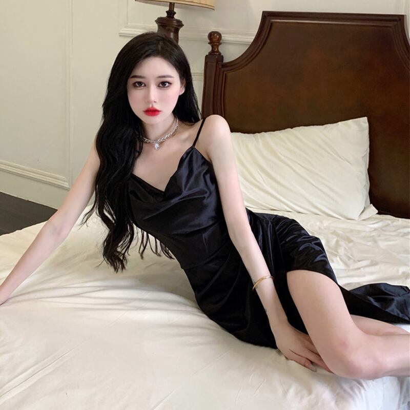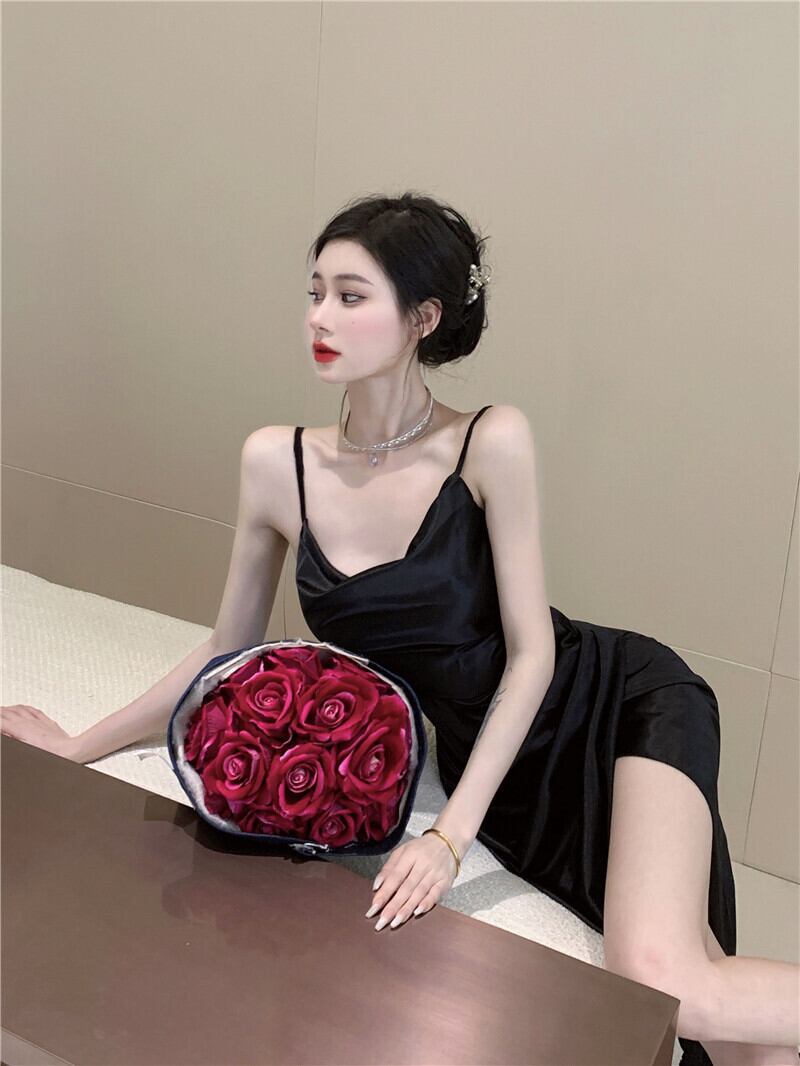 黒のイブニングドレスライトラグジュアリーニッチハイエンドバンケット気質ハイエンドセクシースイングカラーミドル丈サスペンダードレス micat80053430325