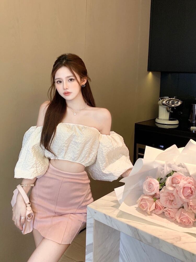 フレンチシックトップショートサマーウィメンズ2022スウィートでスパイシーなセクシーなワンワードカラーオフショルダーランタンスリーブシャツ micat65605815709