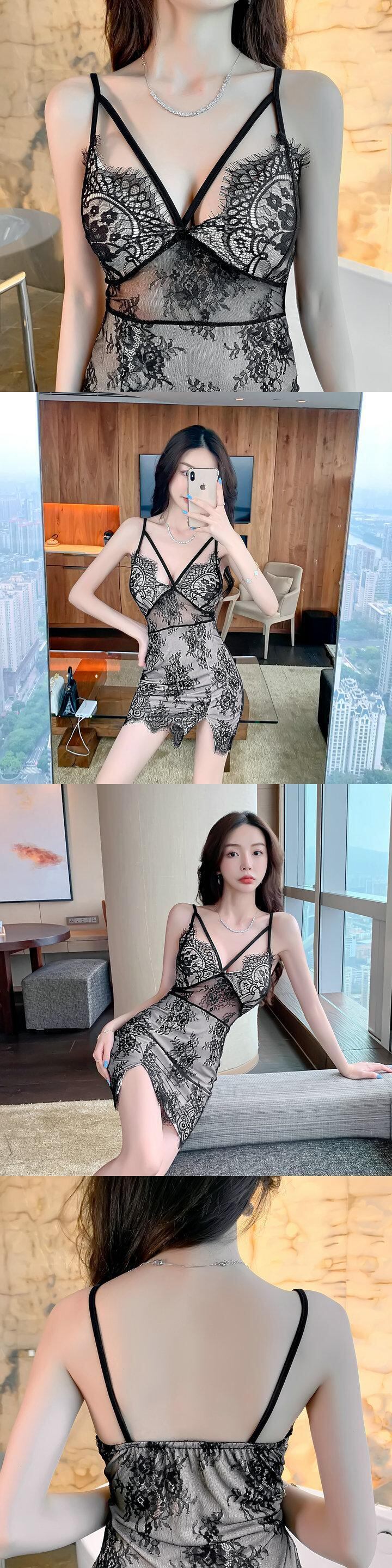 ナイトクラブの女性のナイトクラブの技術者のオーバーオールセクシーなローカットの深いVネックまつげレースサスペンダードレス micat10469949411