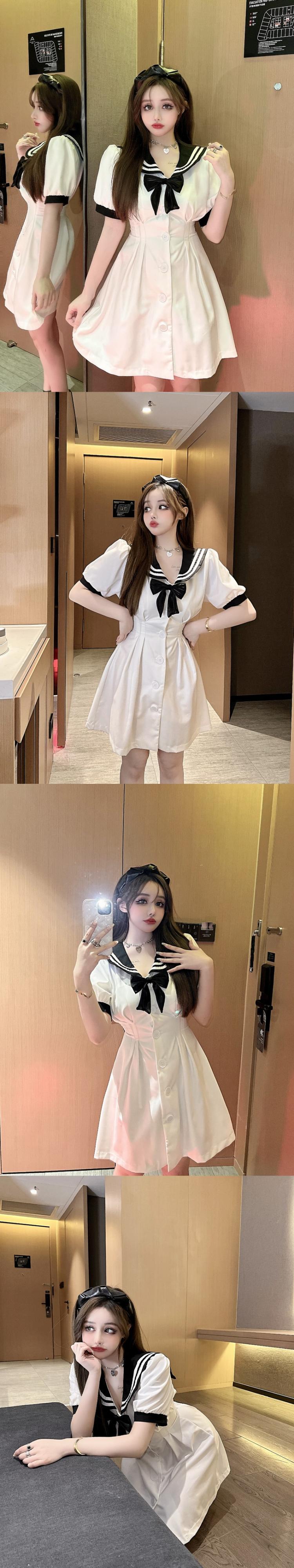 jkユニムピュアデザイアカレッジスタイルスウィートボウネクタイネイビーカラーフレンチパフスリーブウエストスリムドレス micat5090363807