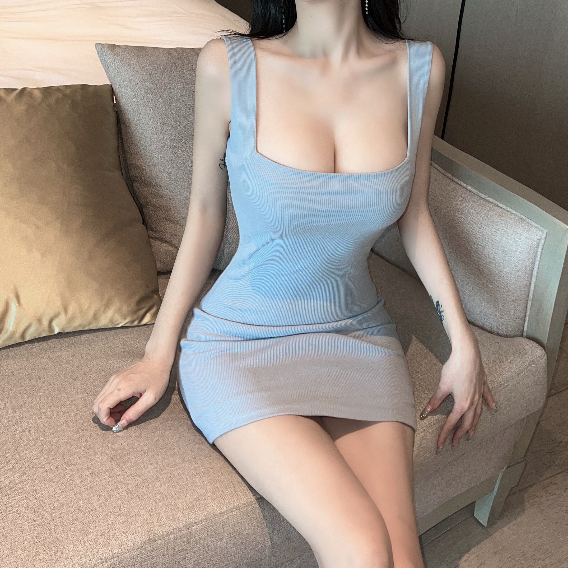 スリングドレス夏の純粋な欲望風無地セクシーなローカットスクエアネック伸縮性ニットボトミングドレス micat86098110822