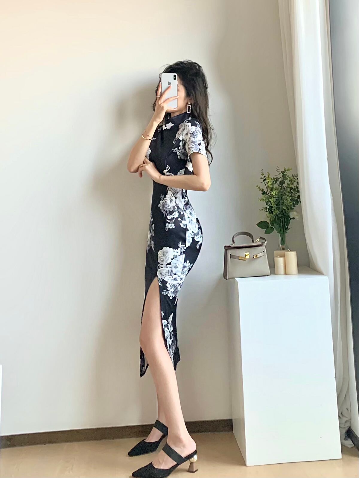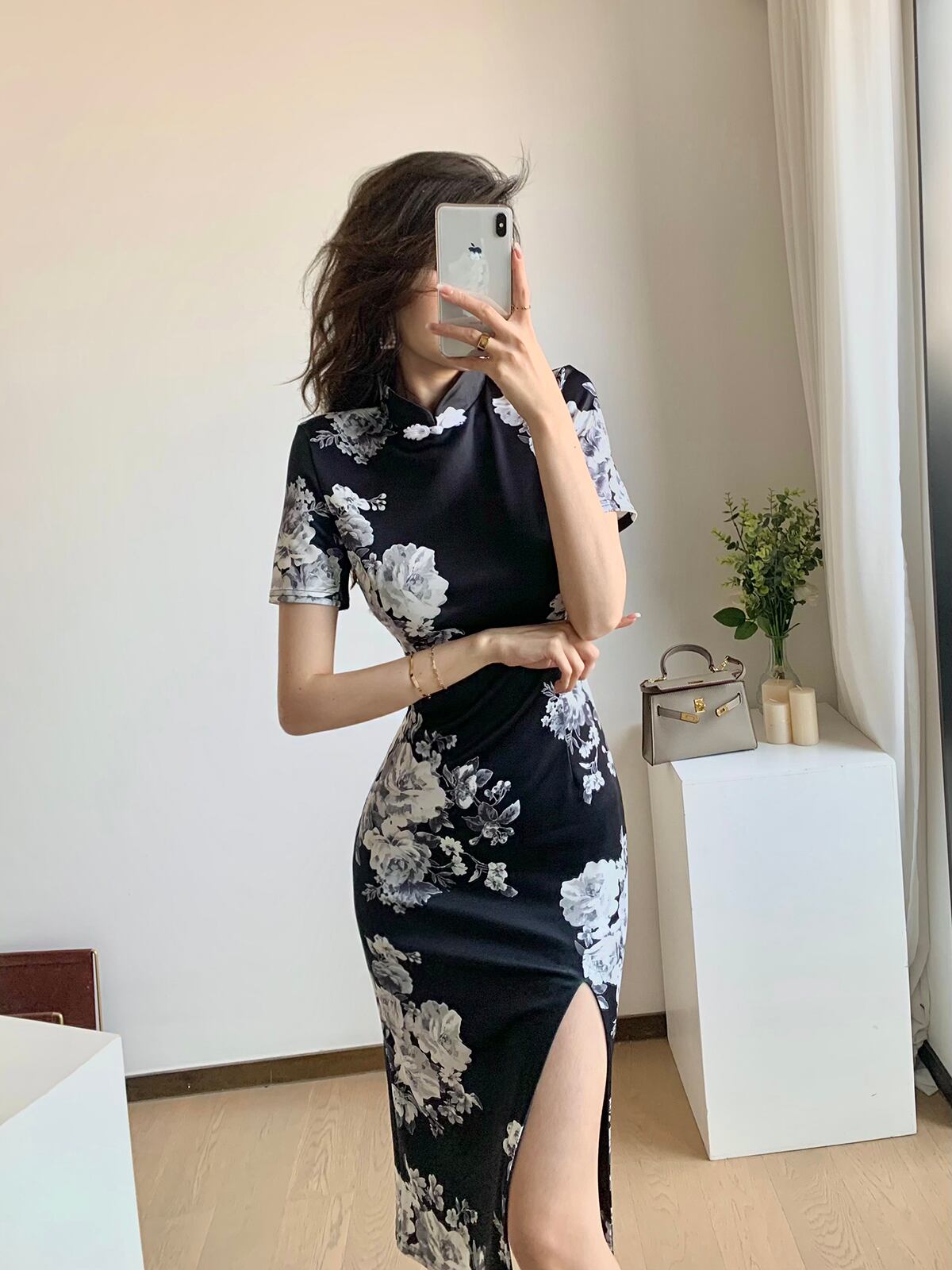 改良されたチャイナドレス2022新しいレトロ共和国スタイルのプリント気質ハイエンドライトクックドスプリットミドル丈ドレス micat81173529009