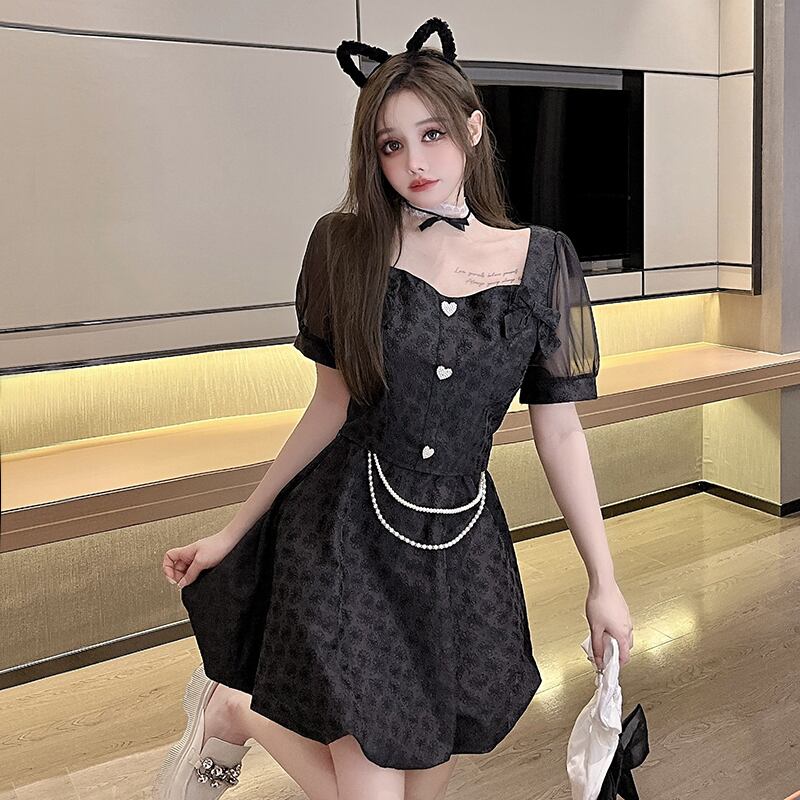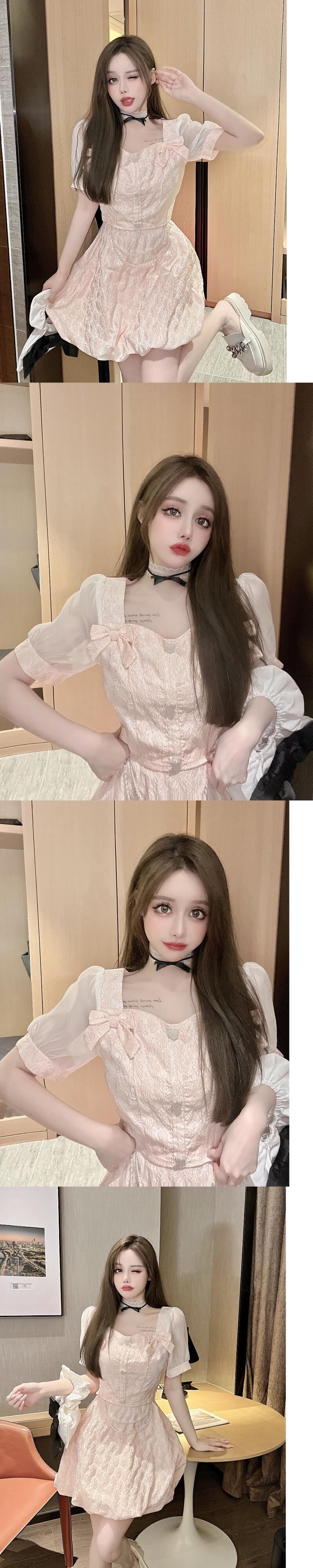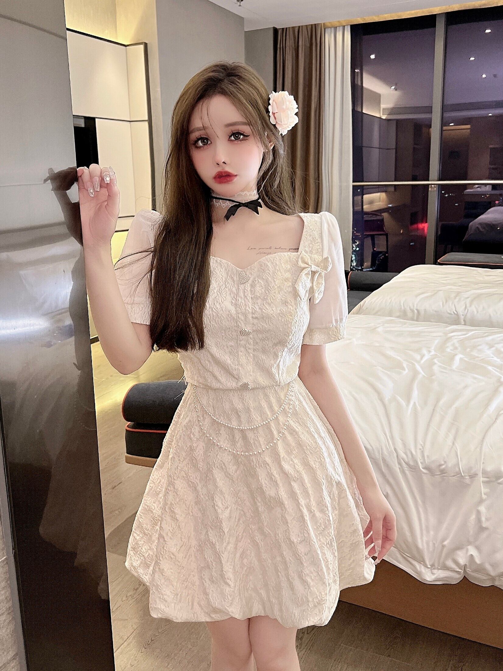 デイリードレススーツサマーフレンチスウィートスクエアネックパフスリーブトップ+ウエストAラインスカートツーピースセット micat57537062318