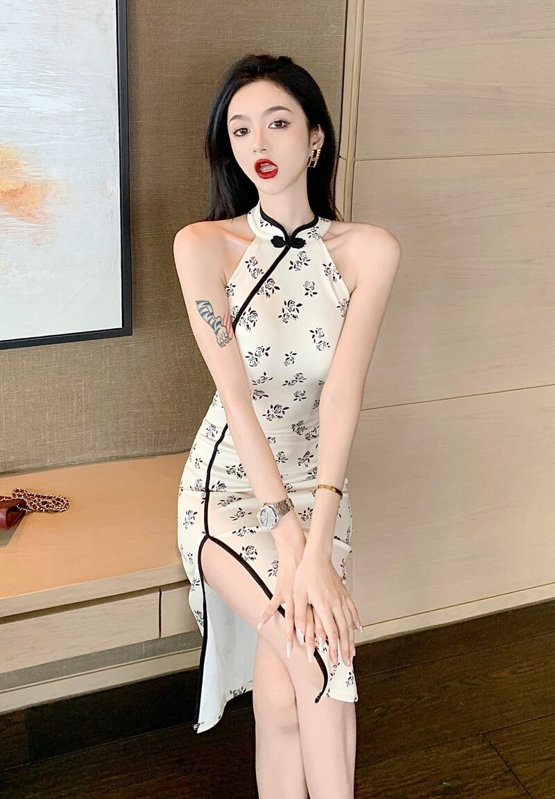 ナショナルスタイルのチャイナドレス若いレトロな共和国スタイルのセクシーなオフショルダーの改良されたミドル丈のオフショルダーのホルターネックドレス micat24864332517