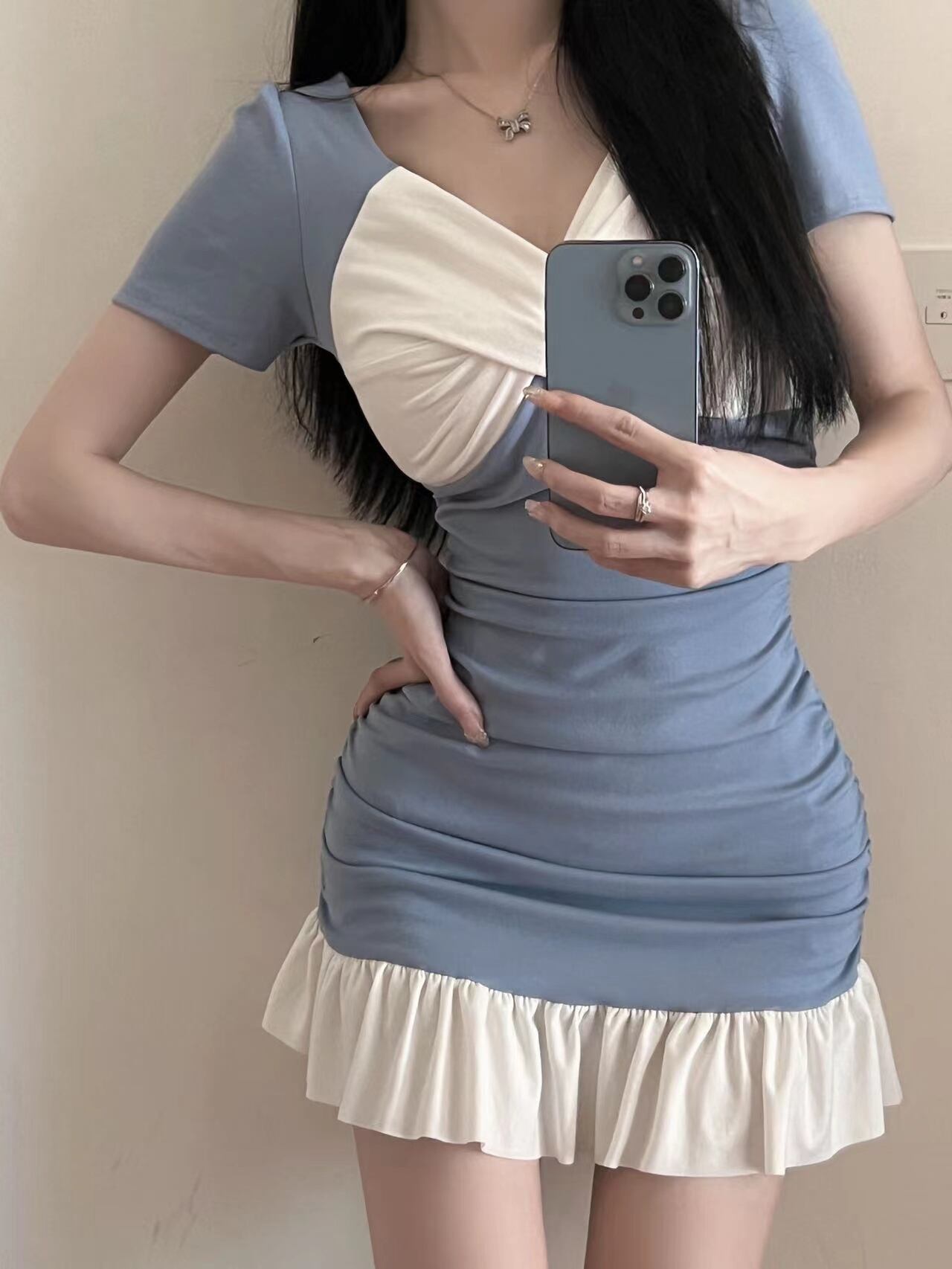 ライブ放送服ポジェニック女性アンカー服フランス気質セクシーVネックコントラストカラー半袖ヒップパックフィッシュテールドレス micat99391351969