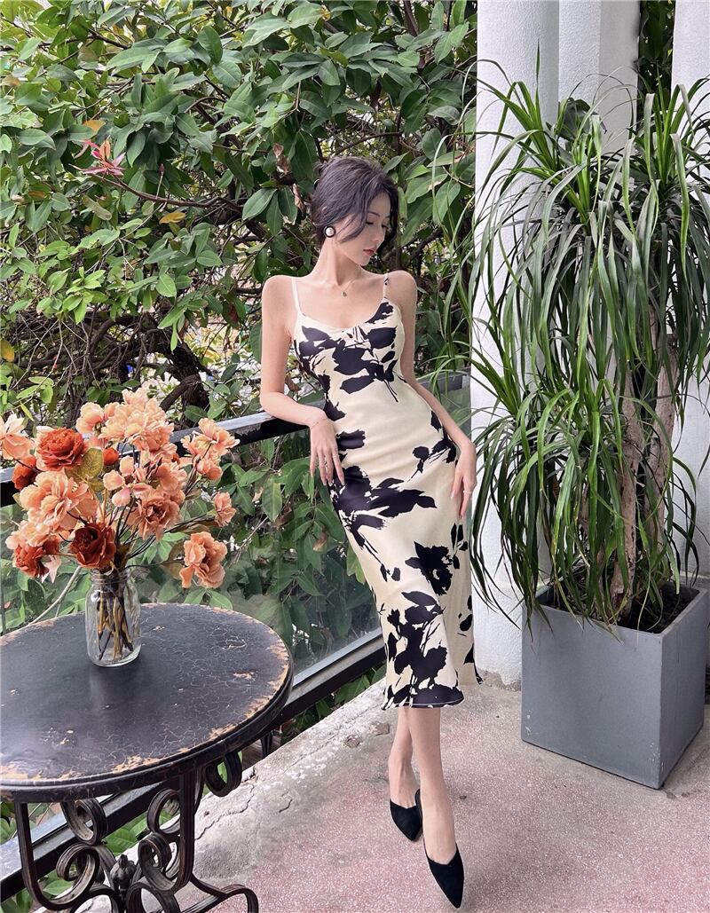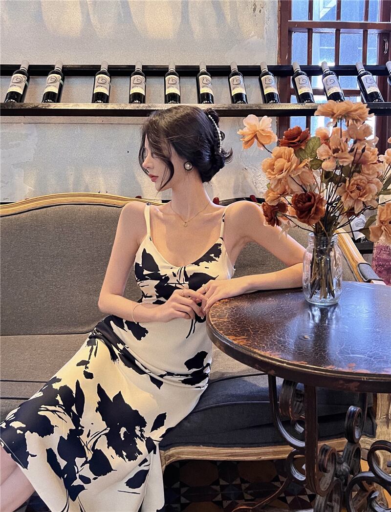 ヘップバーンスタイルのイブニングドレススカートフェミニンな気質ライトラグジュアリーニッチハイエンドフレンチレトロプリントセクシーなサスペンダードレス micat84047075514