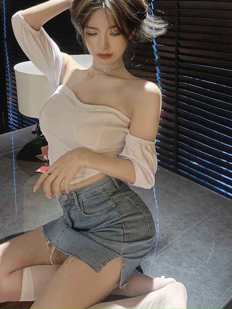 生放送の服、ポジェニックな女性のアンカー服、フレンチパフスリーブ、セクシーな一言の襟、オフショルダーのショートトップ micat78778091883