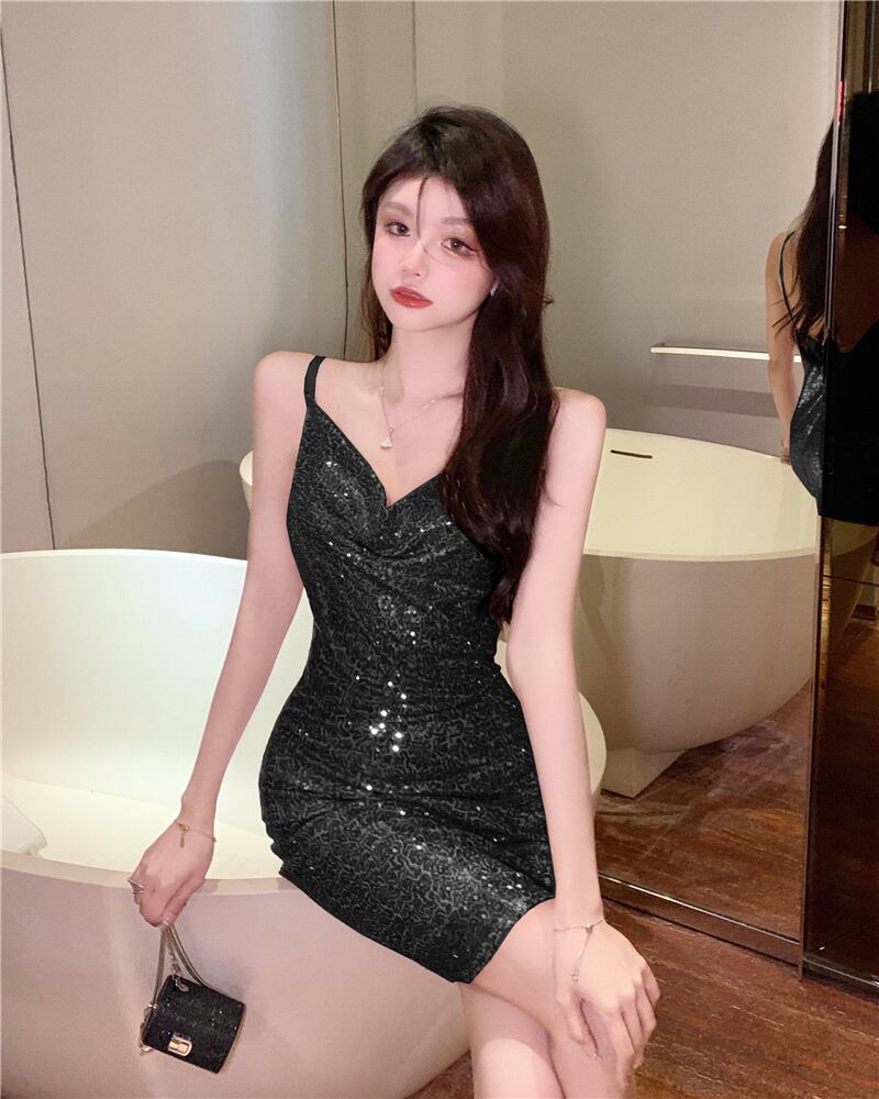 セクシーなナイトクラブの婦人服きらめくスパンコールショートイブニングドレスeigntemperamentVネックスリムバッグヒップサスペンダードレス micat80157498093