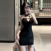 夜の作業服ナイトクラブの作業服店女性の気質セクシーなローカットVネック黒サスペンダードレス micat20532679381