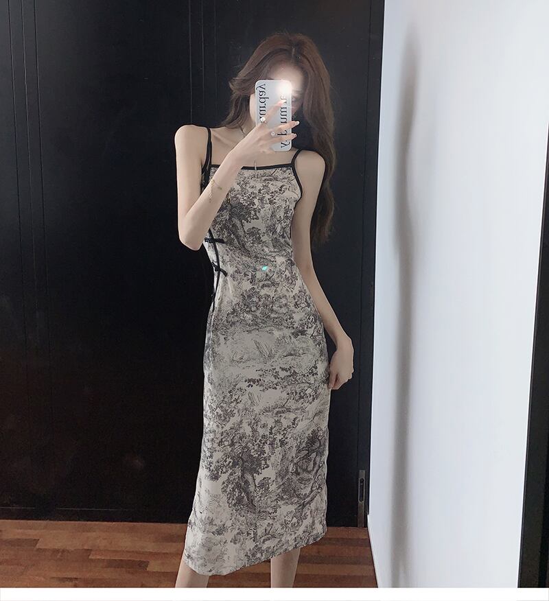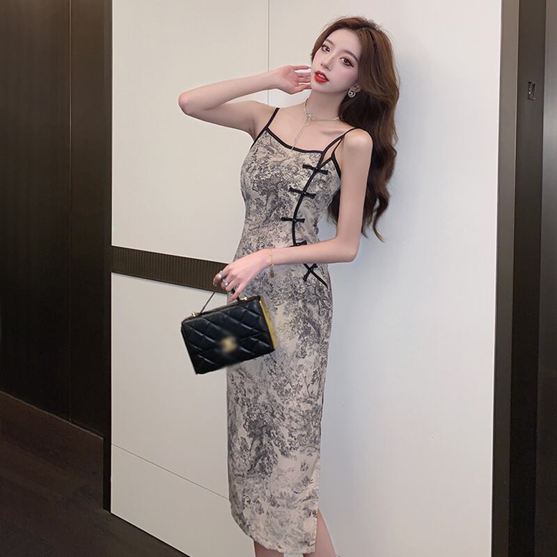 改良されたチャイナドレス2022新しい夏のレトロなバックル中国風のプリントセクシーなミドル丈のサスペンダードレス micat32888315362