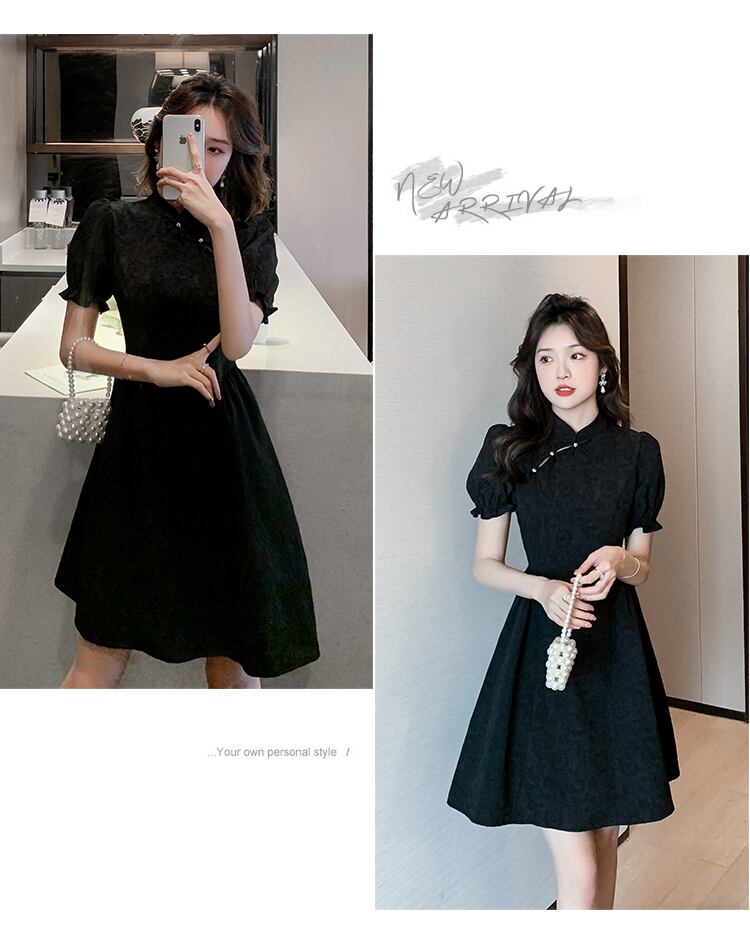 ブラックチャイナドレスヤングガールサマーフレンチレトロ改良パフスリーブ気質ウエスト薄型ドレス micat99692818752