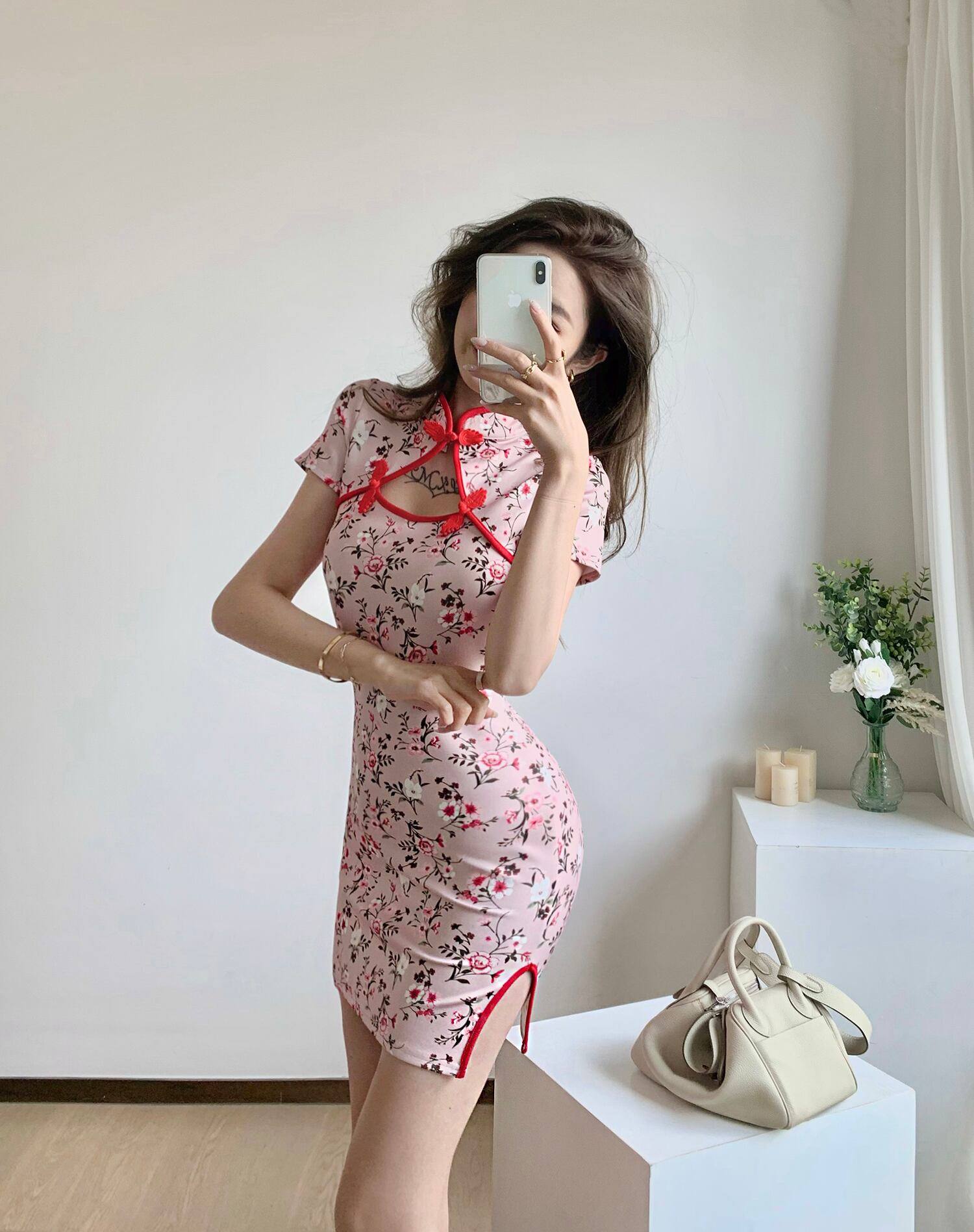ピンクの花の改良されたチャイナドレスの若い女の子のスタイル毎日のホットな女の子セクシーな中空改良されたヒップスリットドレス micat7365559520
