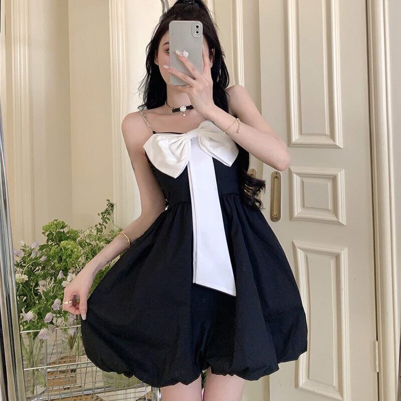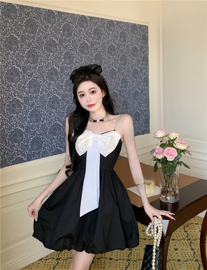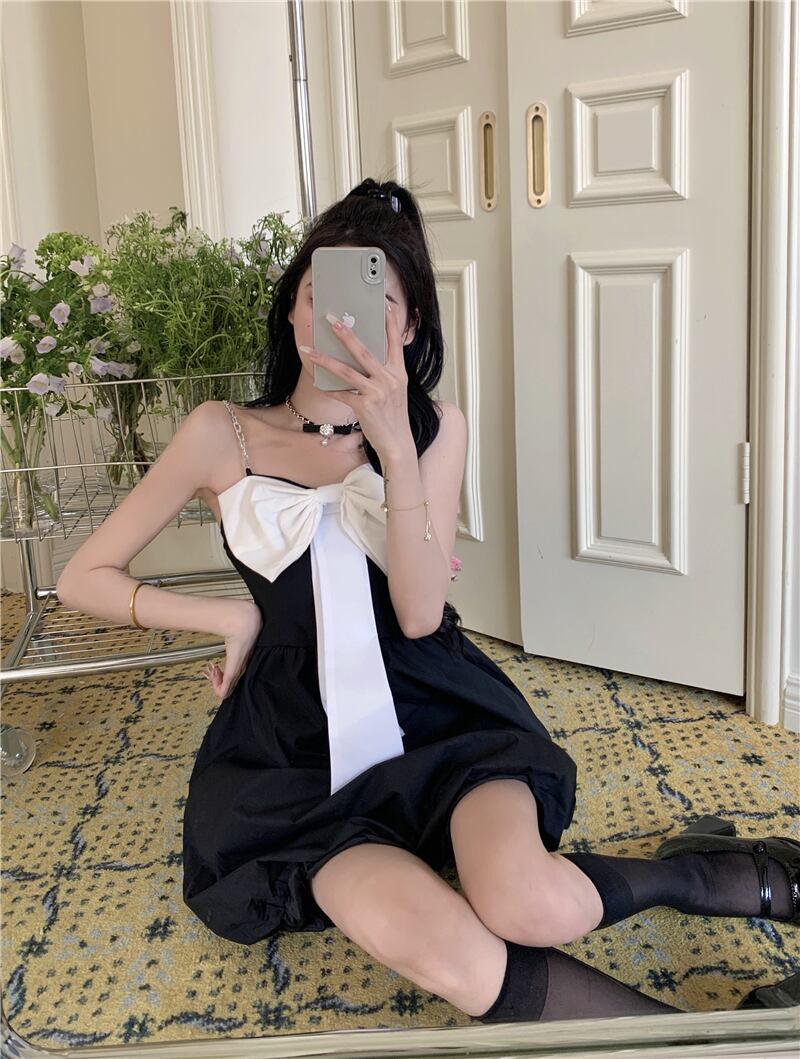 フレンチヘップバーンスタイルリトルブラックドレスショートサマーピュアデザイアホットガールスウィートボウパフィースリングドレス micat49261374557