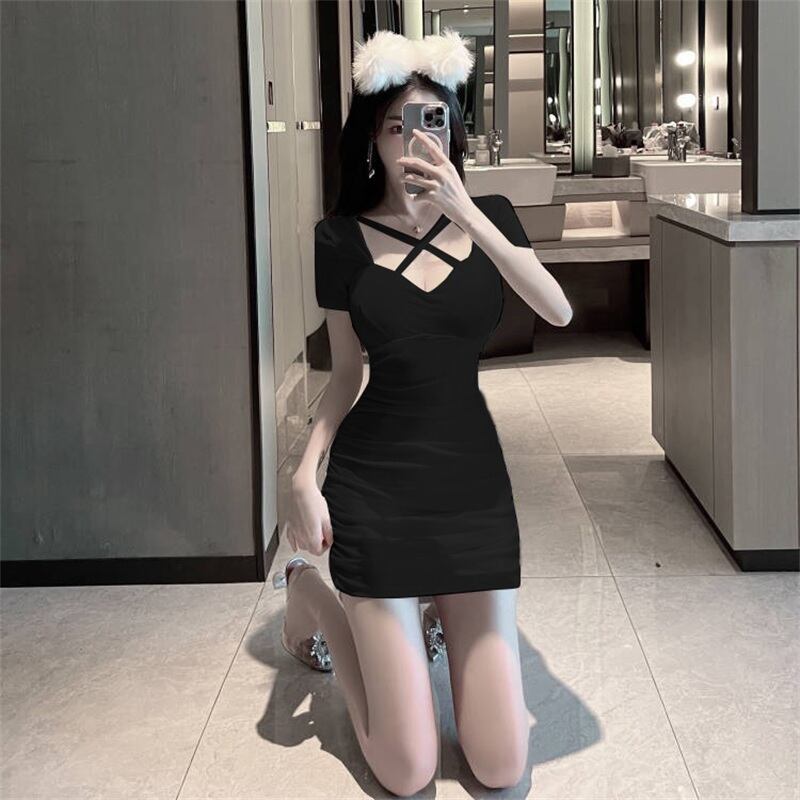夜の作業服店の女性の気質セクシーなローカットクロスディープVネック半袖スリムバッグヒップドレス micat14744330398