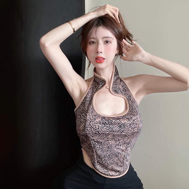 生放送の服を着て外でベストの女性の夏ポジェニック女性のアンカー服レトロなヘビ革のパターンセクシーな背中の開いたホルタートップ micat52935059949