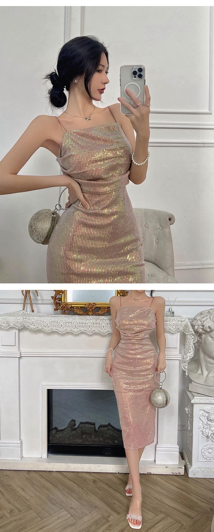 風のイブニングドレススカートフェミニンな気質ライトラグジュアリーニッチハイエンドバンケット気質セクシーなミドル丈スパンコールサスペンダードレス micat85518160773