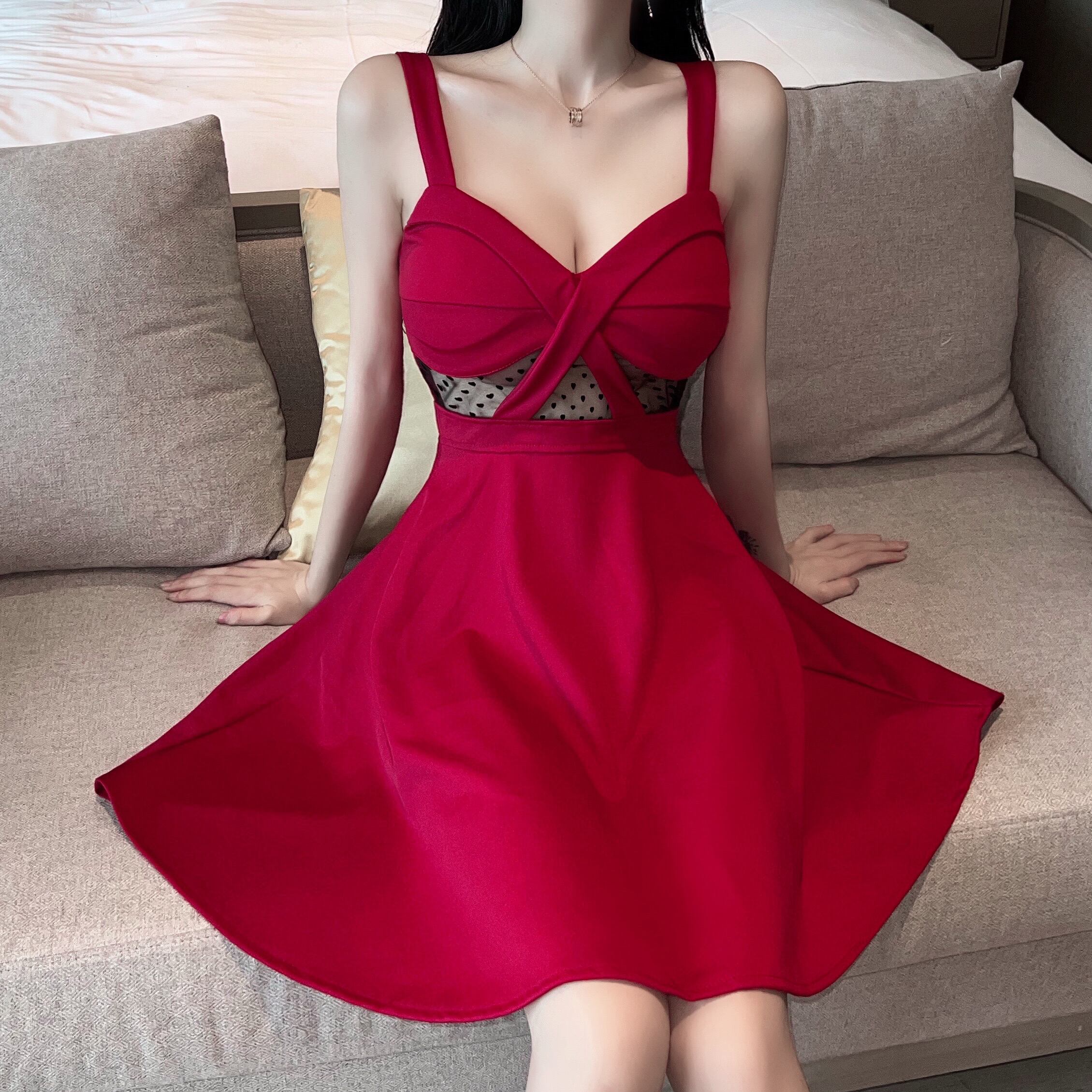 夜の作業着店の女性の気質セクシーなローカットディープVネックメッシュステッチふくらんでいるサスペンダードレス micat68772496217