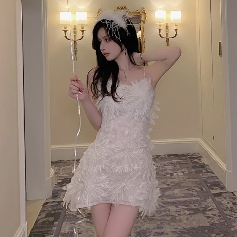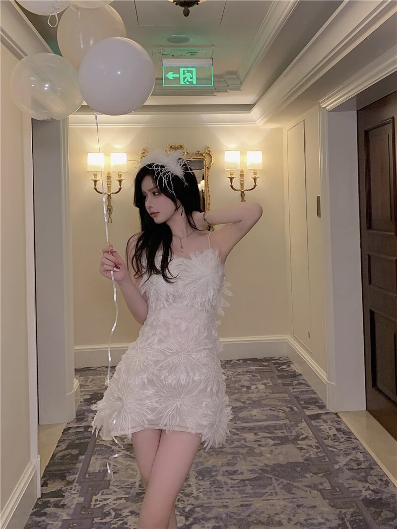 スーパーフェアリーホワイトバースデースモールドレスショートメッシュフェザーセクシースリムスリムバッグヒップサスペンダードレス micat40128086363