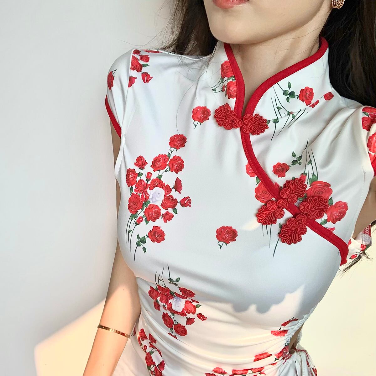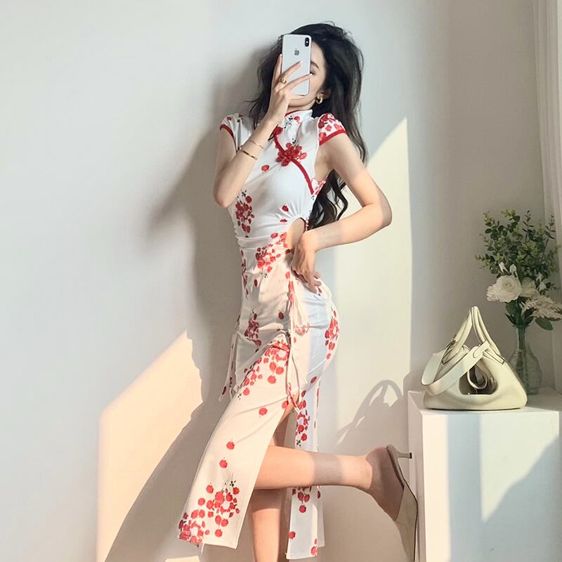 チャイナドレスヤング音律ハイエンド夏中国風レトロプリントセクシー中空スリットミドル丈ドレス micat20168398085