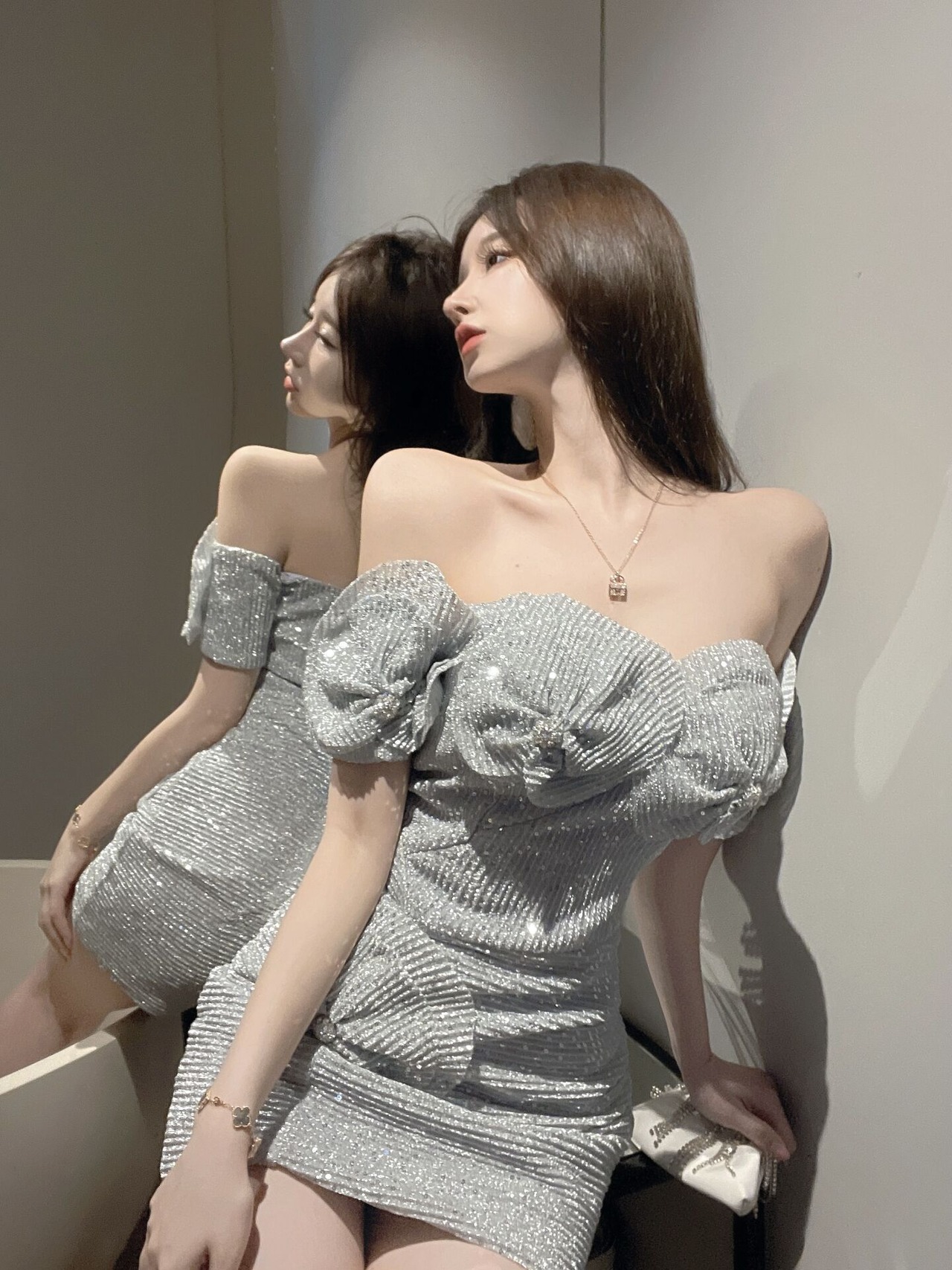 フランスのスーパーフェアリーバンケット気質小さなドレス短い光沢のある夜の女性のセクシーなワンショルダーチューブトップドレス micat3139355269
