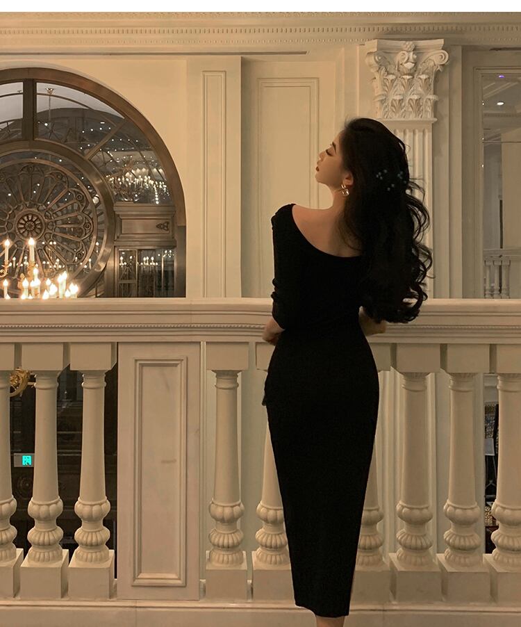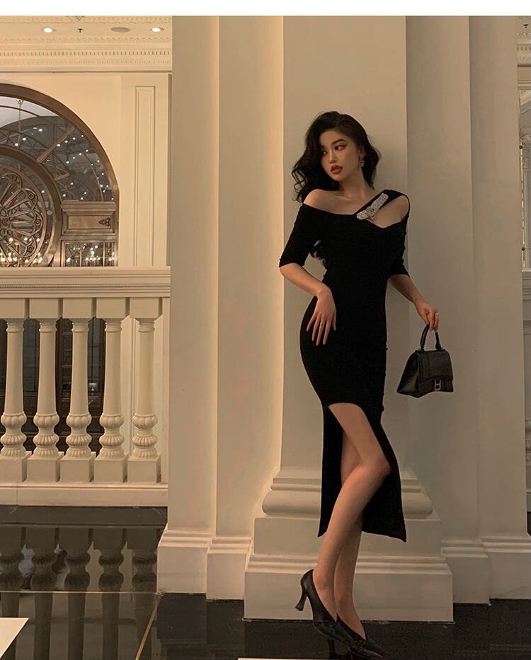 黒のイブニングドレスロングスカート女性のデザインセンスニッチ気質セクシーな斜めの襟くり抜かれたスリムフィット5点袖ドレス micat1402600468
